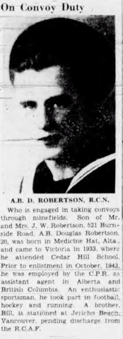 Son of Mr. and Mrs. J.W. Robertson. Born in Medicine Hat, AB. Attended school at Cedar Hill School in Victoria, BC. Worked for CPR before to enlistment. Had a brother Bill Robertson who served in the RCAF.