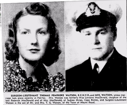 Wedding announcement for Surg-Lt Thomas Pembroke Watson to Lorraine MacDonald