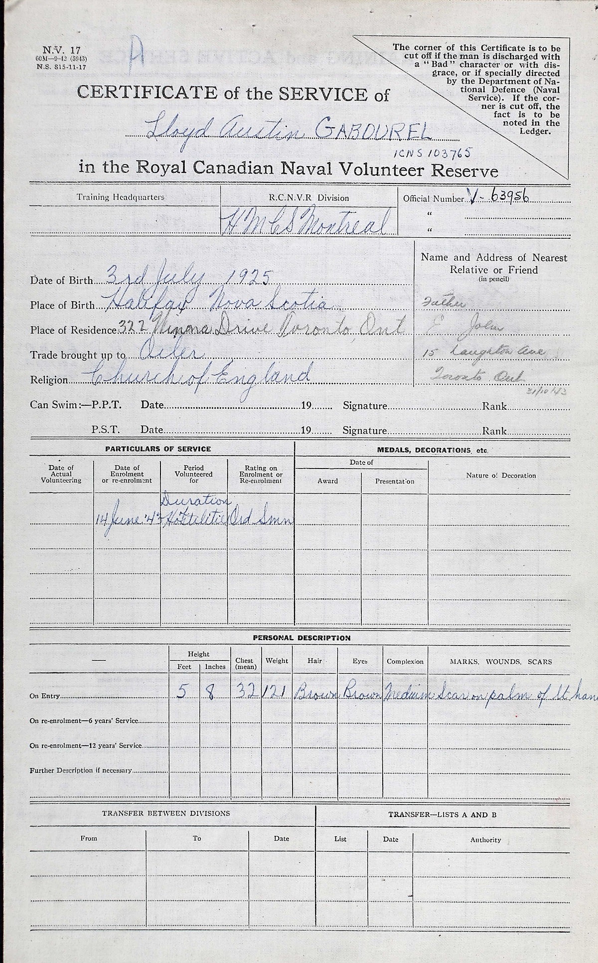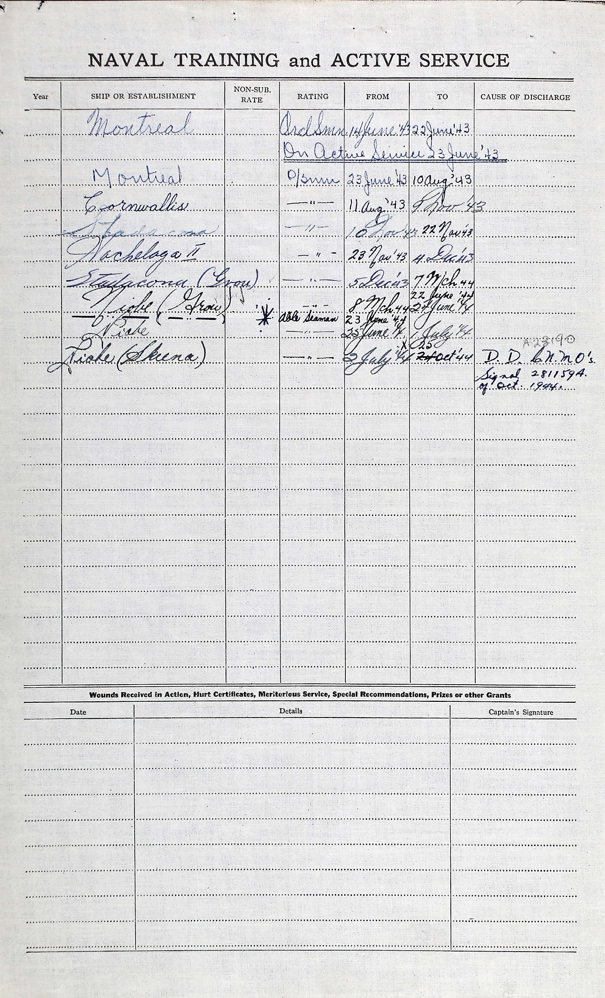 Ships served in: HMCS MONTREAL - Enlisted 14 Jun 1943. Commenced Active Service 23 Jun 1943 HMCS CORNWALLIS - Drafted to CORNWALLIS 11 Aug 1943 as an OS, RCNVR HMCS STADACONA - Drafted to STADACONA 10 Nov 1943 as an OS, RCNVR HMCS HOCHELAGA II - Drafted to HOCHELAGA II 23 Nov 1943 as an OS, RCNVR HMCS GROU - Served in GROU 05 Dec 1943 - 24 Jun 1944 as an OS, RCNVR * Rated AB 23 Jun 1944 HMCS NIOBE - Drafted to NIOBE 25 Jun 1944 as an AB, RCNVR HMCS SKEENA - Drafted to SKEENA 02 Jul 1944 as an AB, RCNVR