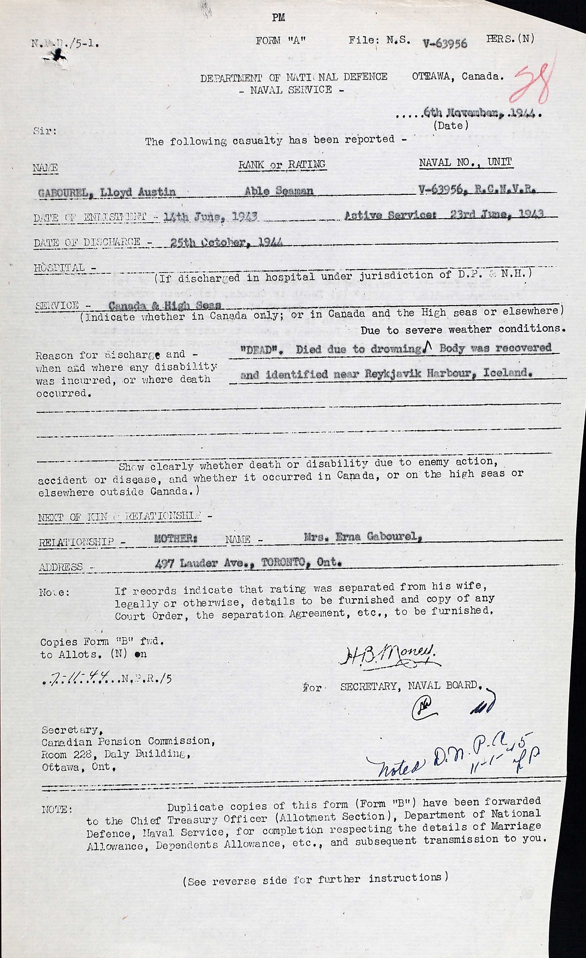 AB Gabourel drowned while trying to get a safety line ashore so that the remaining crew could be safely removed from SKEENA. His body later recovered near Reykjavik Harbour. He is buried in the Fossvogur Cemetery, Reykjavik, Iceland.