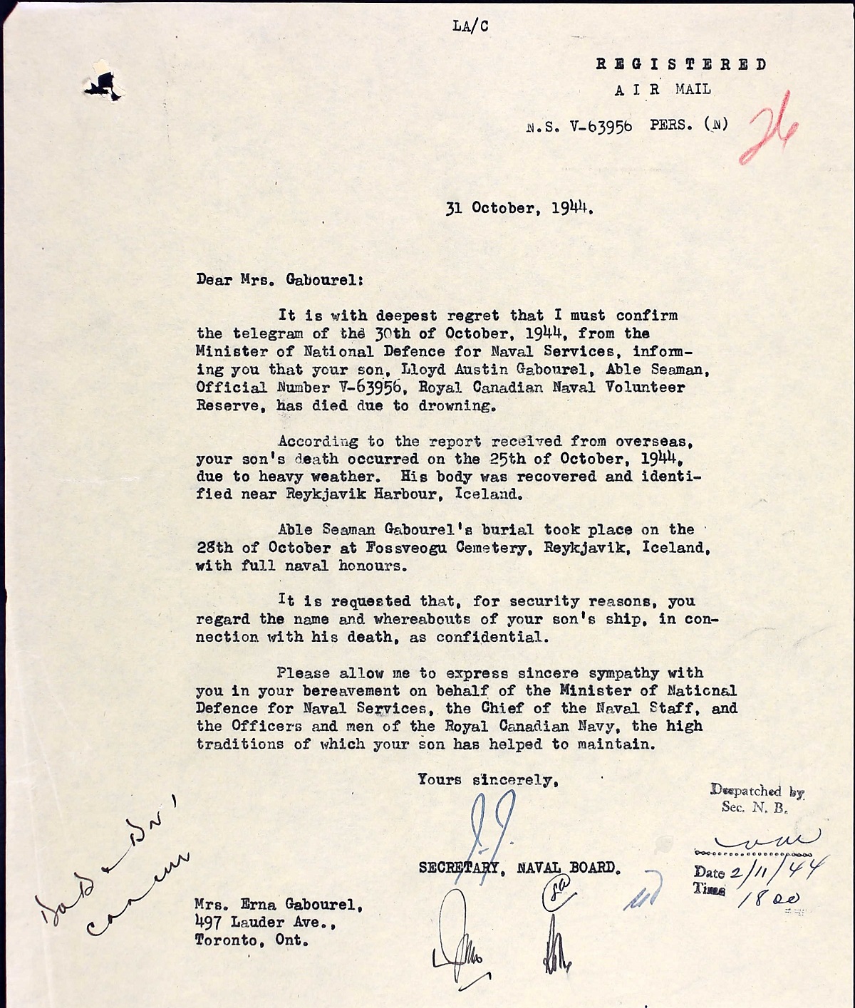 (LG01) Seaman Lloyd Gabourel (LG02-LG03) Certificate of Service - pages 1 and 2 (LG04) Report of Death (LG05) Headstone for AB Gabourel in the Fossvogur Cemetery, Reykjavik, Iceland.