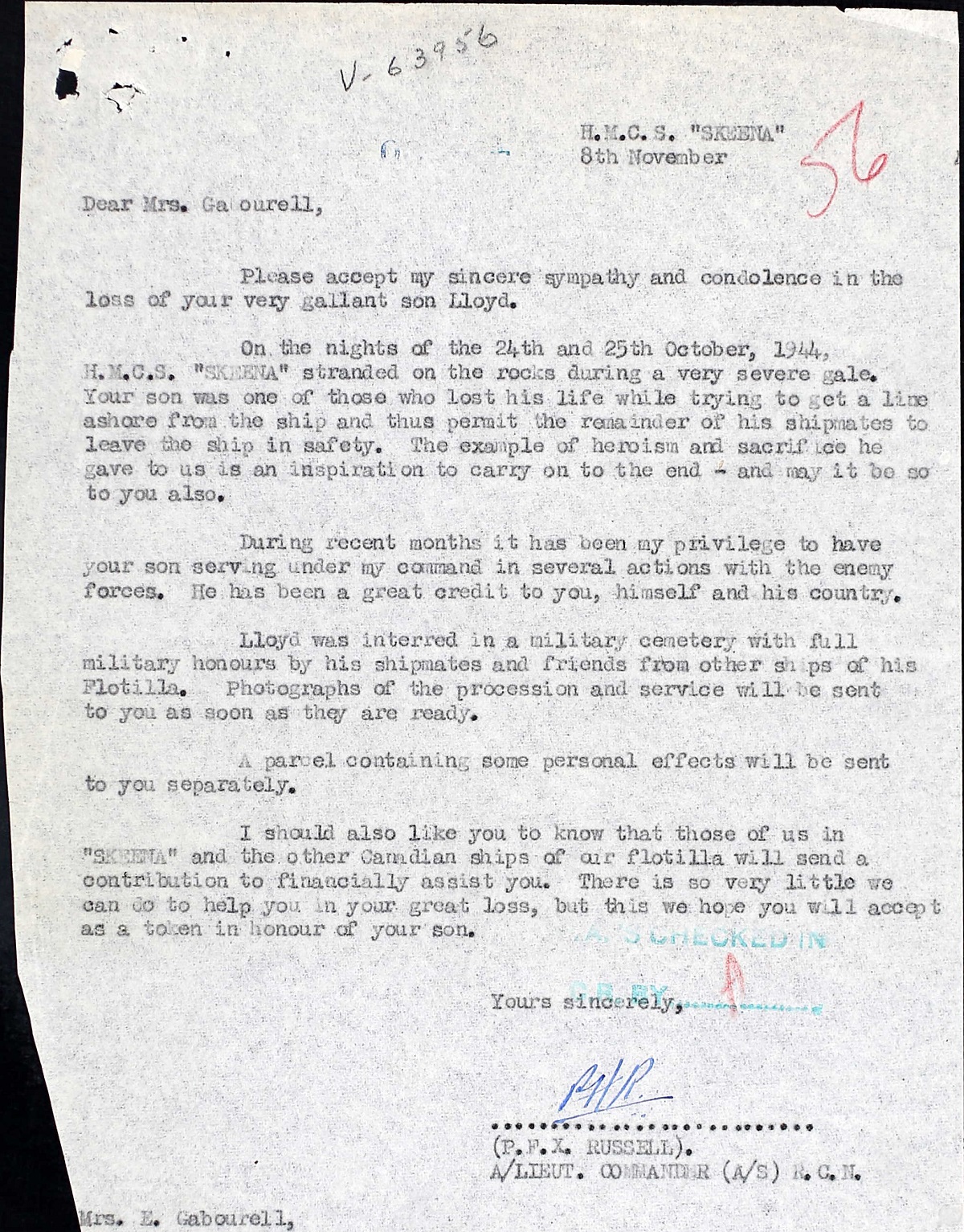 GABOUREL, Lloyd Austin, AB, V63956, RCNVR, killed - 25 Oct 1944, HMCS SKEENA - Son of Austin Gabourel, and of Erna Gabourel, of Toronto, ON.