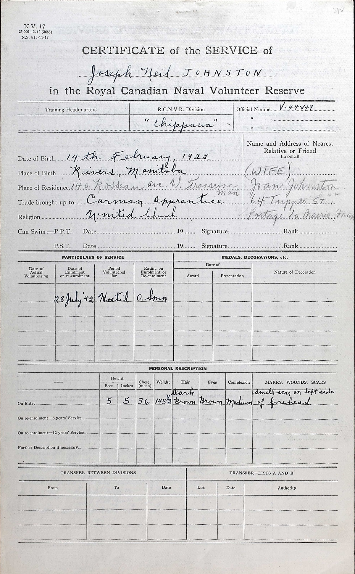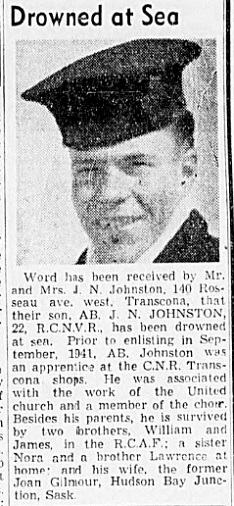 Able Seaman Joseph Neil Johnston son of Mr. and Mrs. J. S. Johnston, 140 Rosseau avenue, Transcona, who has been officially reported to have drowned while on active service, according to information received by his wife, Mrs. J. N. Johnston, 191 Ethelbert street, Winnipeg. This was his second time overseas, and he took part in the invasion of France. He is also survived by a sister, Nora, and a brother, Lawrence, at home and two brothers, William and James, in the R.C.A.F. overseas. He received his education in Transcona, and prior to enlistment was employed in the C.N.R. shops at Transcona.