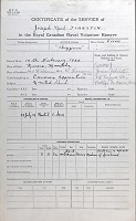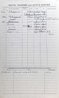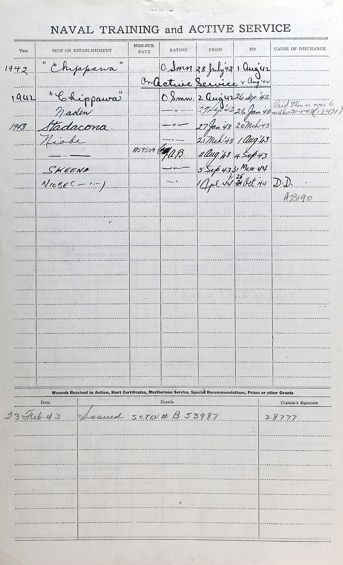 Ships served in: HMCS CHIPPAWA - Enlisted 28 Jul 1942. Commenced Active Service 02 Aug 1942 HMCS NADEN - Drafted to NADEN 27 Sep 1942 as an OS, RCNVR * Rated SD 23 Jan 1943 HMCS STADACONA - Drafted to STADACONA 27 Jan 1943 as an OS, RCNVR HMCS NIOBE - Drafted to NIOBE 21 Mar 1943 as an OS, RCNVR * Rated AB 02 Aug 1943 HMCS SKEENA - Drafted to SKEENA 05 Sep 1943 as an AB, RCNVR
