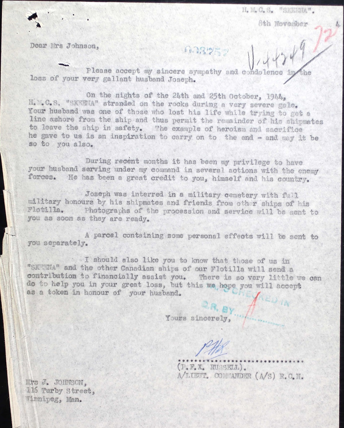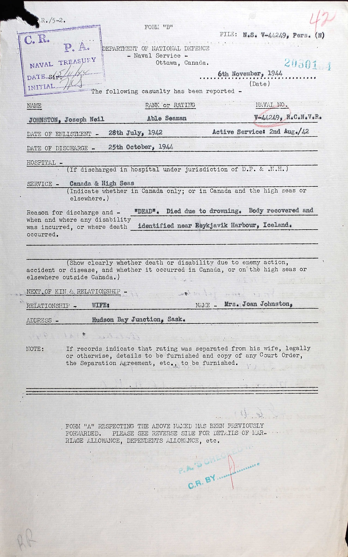 JOHNSTON, Joseph Neil, AB, V44249, RCNVR, died - 25 Oct 1944, HMCS SKEENA - Son of Mr. and Mrs. J.N. Johnston, Transcona, MB; husband of Mrs. J.N. Johnston, Winnipeg, MB.