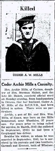 MILLS, Archie William, Coder, V50413, RCNVR, killed - 07 May 1944, HMCS VALLEYFIELD - Son of William S. Mills and Alice Mills, of Essex, Ontario; husband of Helen Marie Mills, of Cottam, Ontario.