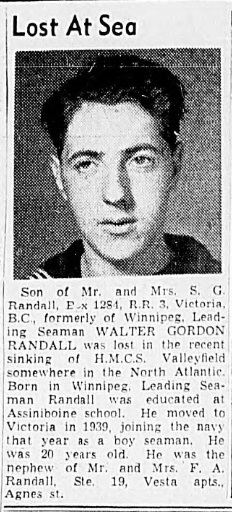 Son of Sydney George and Isabelle Ruth Randall, of Victoria, BC.Leading Seaman Walter Gordon Randall, formerly of St. James, was one of the sailors lost at sea when HMCS Valleyfield was torpedoed. Born in St. James, Manitoba, he attended Assiniboine school prior to moving to Victoria, British Columbia with his parents, Mr. and Mrs. S. G. Randall, in 1939. Enlisting in the navy as a boy seaman in 1941, he had risen to the rank of Leading Seaman when reported lost. Besides his parents, he is survived by a sister, Mrs. John Mitchell of Victoria. An Uncle, F. A. Randall. Lives at suite 19, Vesta apartments, Winnipeg.