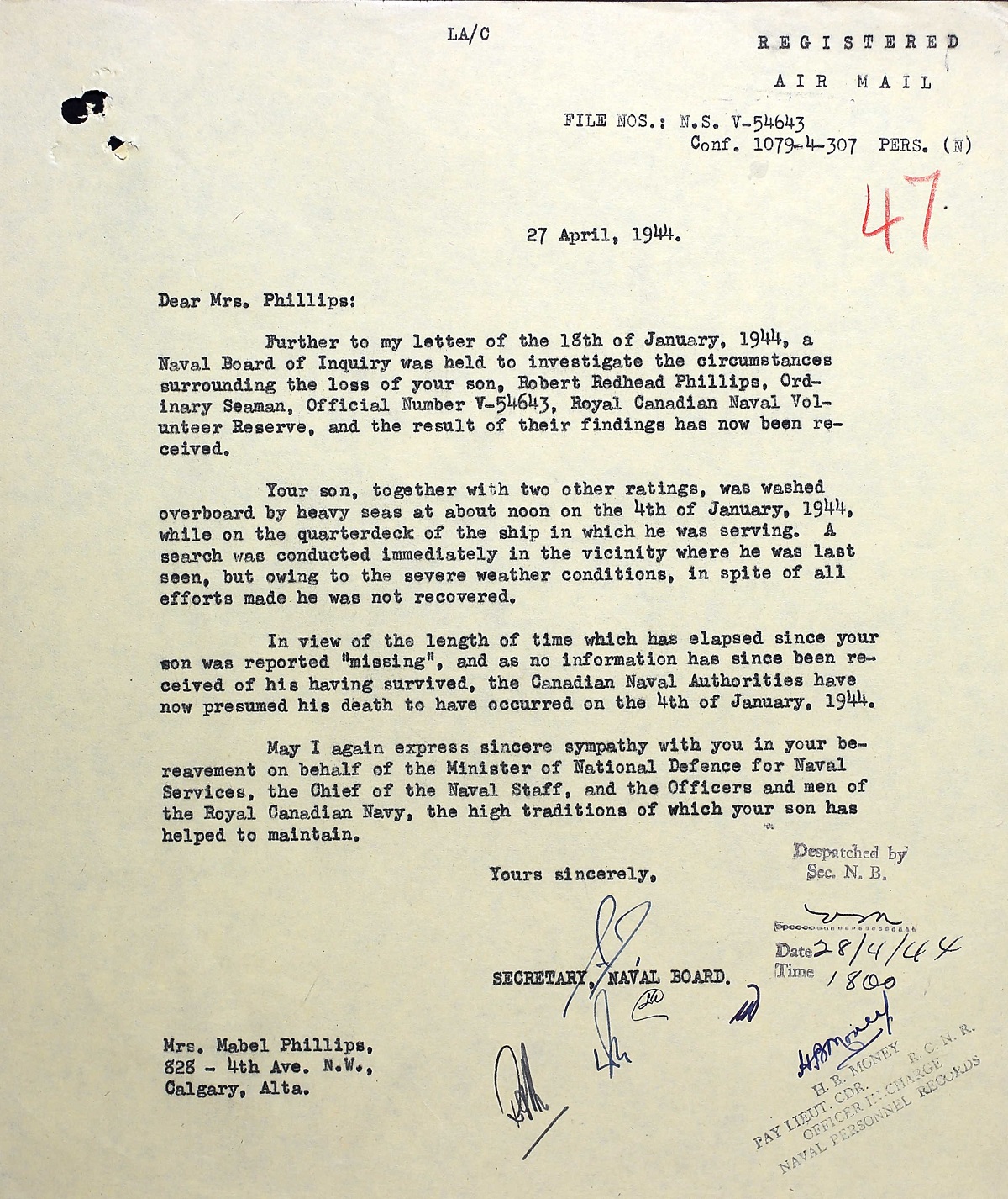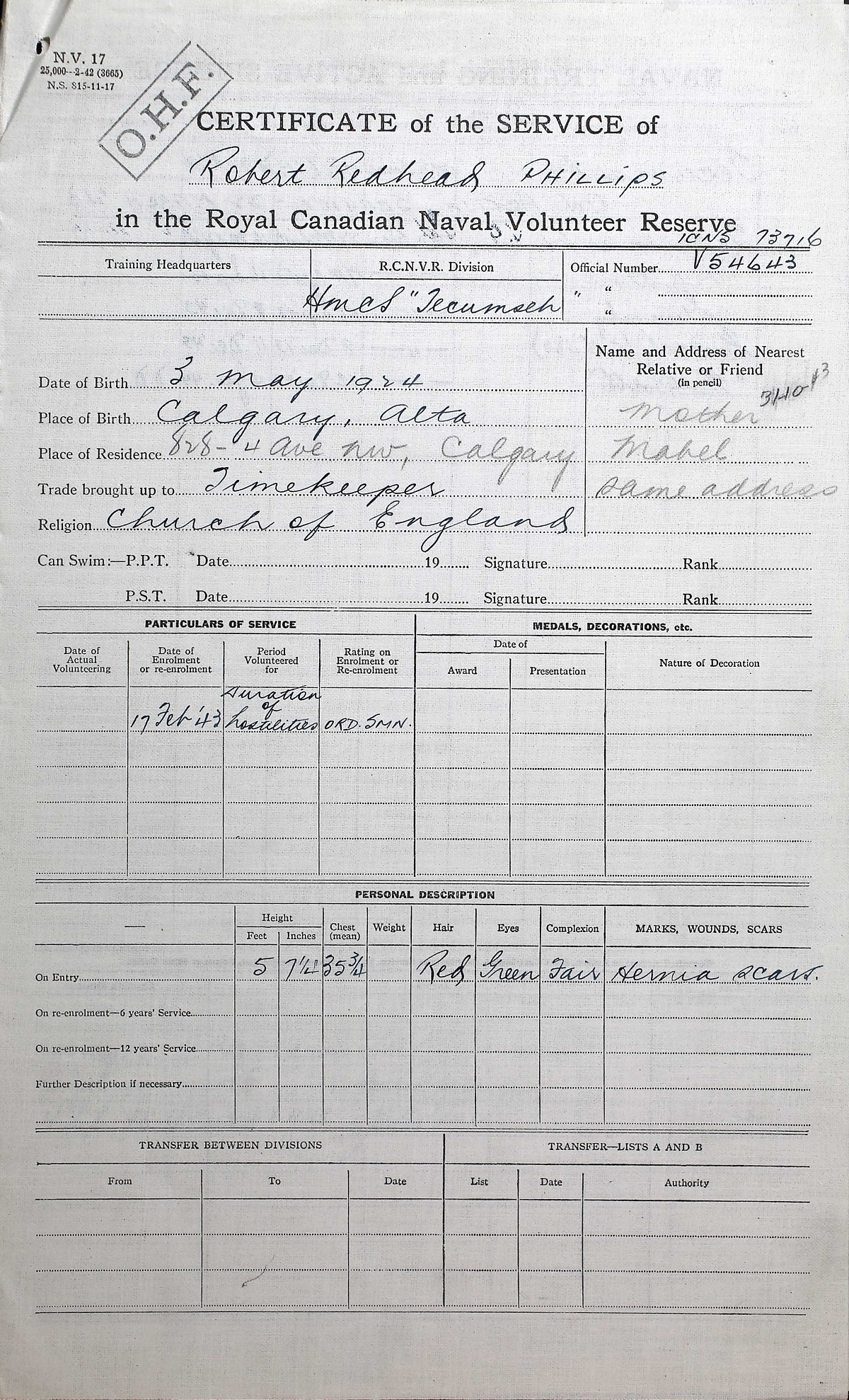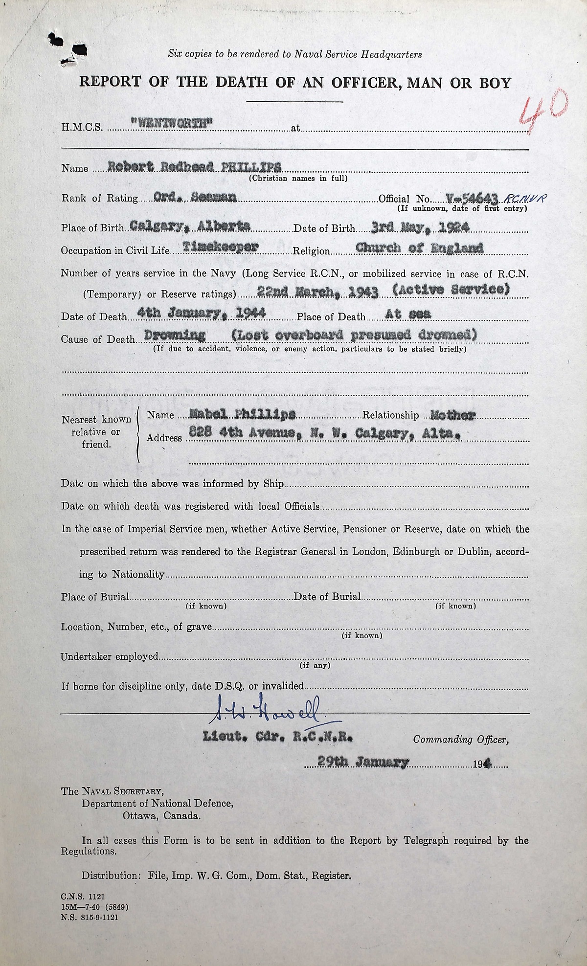 PHILLIPS, Robert R., OS, V54643, RCNVR, MPK - 04 Jan 1944, HMCS WENTWORTH - Son of Morris Lloyd and Mabel S. Phillips, of Calgary, AB.