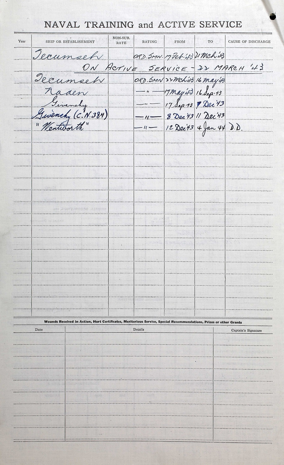 Ships served in: RCNVR DIVISION CALGARY - Enlisted 17 Feb 1943. Commenced Active Service 22 Mar 1943 HMCS GIVENCHY - Served in GIVENCHY 17 Sep 1943 - 11 Dec 1943 as an OS, RCNVR HMCS WENTWORTH - Drafted to WENTWORTH 12 Dec 1943 as an OS, RCNVR