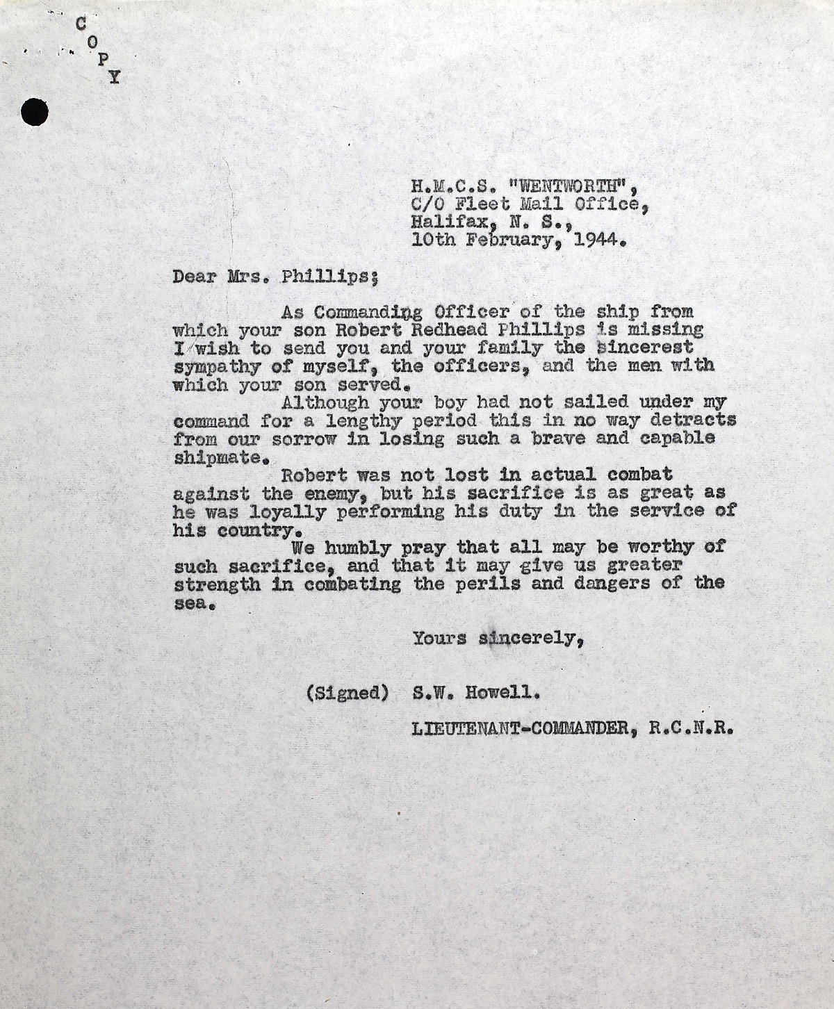 Ordinary Seaman R. R. Phillips was lost overboard when serving on HMCS WENTWORTH during heavy weather in the North Atlantic. Ordinary Seaman Phillips together with two other ratings were washed overboard, Petty Officer F. W. Lawrence, R.C.N.V.R. and Able Seaman W. R. Mennell, R.C.N.