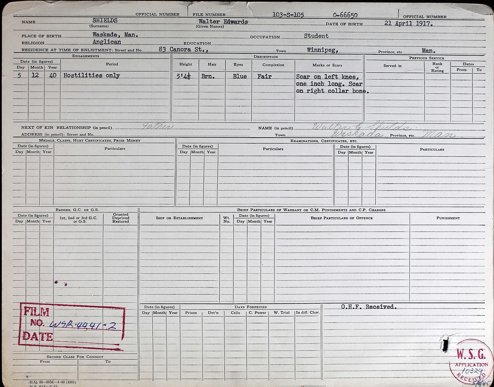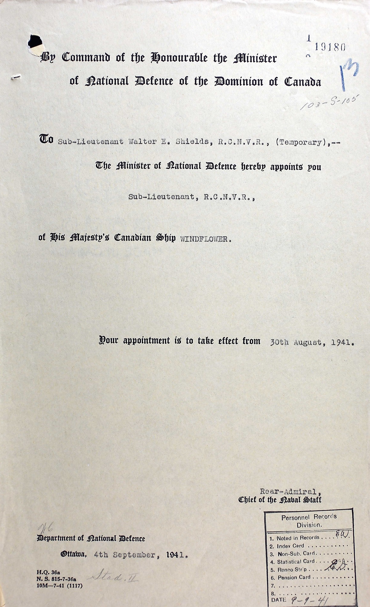 (WS01) Portrait of SLt Shields (WS02-WS03) Record of Service (WS04) Appointment to HMCS WINDFLOWER (WS05) Casualty Report