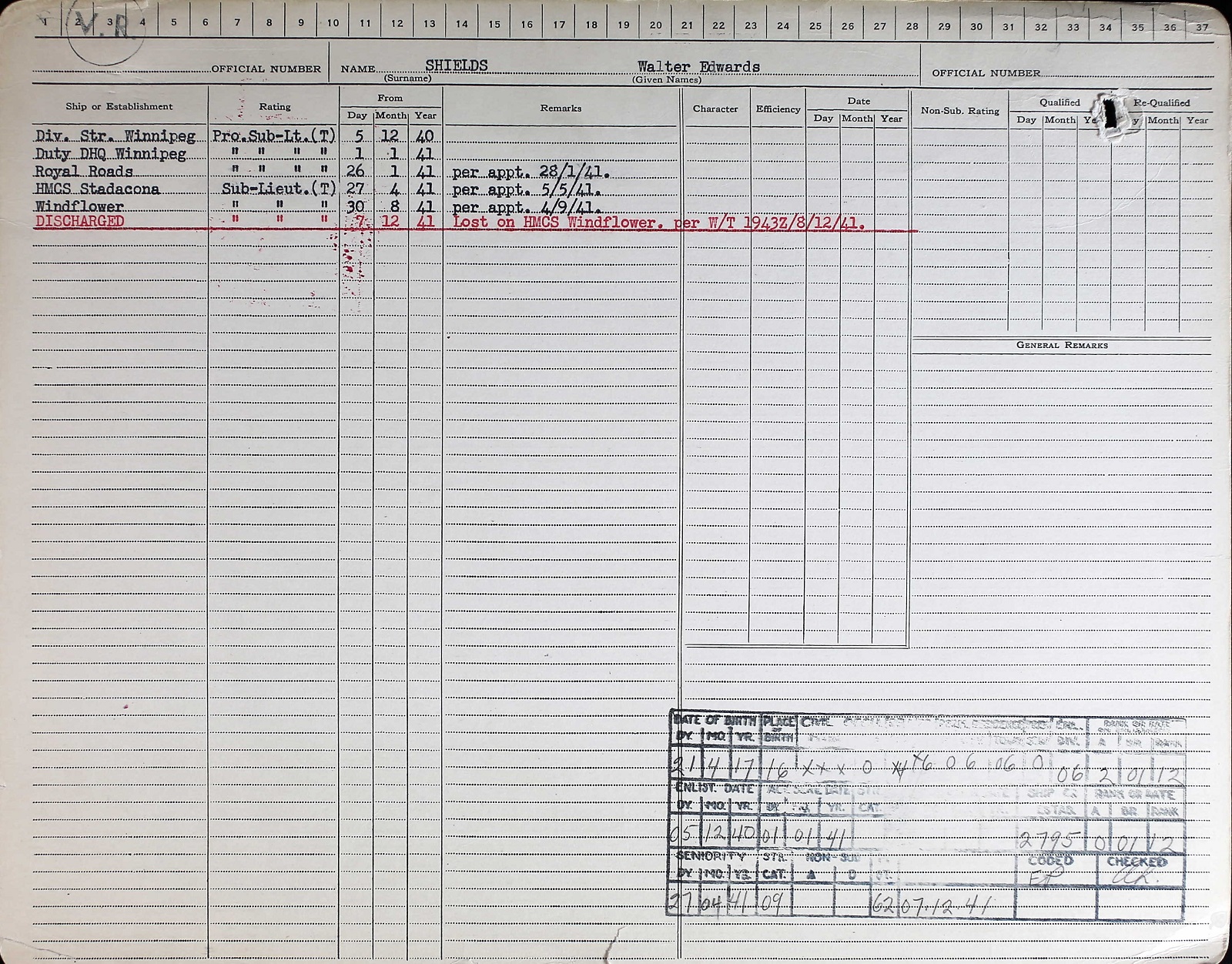 Ships served in: WINNIPEG DIVISION RCNVR - Enlisted 05 Dec 1940 as a Prob SLt, RCNVR. Commenced Active Service 01 Jan 1941 HMCS ROYAL ROADS - Appointed to ROYAL ROADS 26 Jan 1941 as a Prob. SLt, RCNVR HMCS STADACONA - Appointed to STADACONA 27 Apr 1941 as a SLt, RCNVR HMCS WINDFLOWER - Appointed to WINDFLOWER 30 Aug 1941 as a SLt, RCNVR