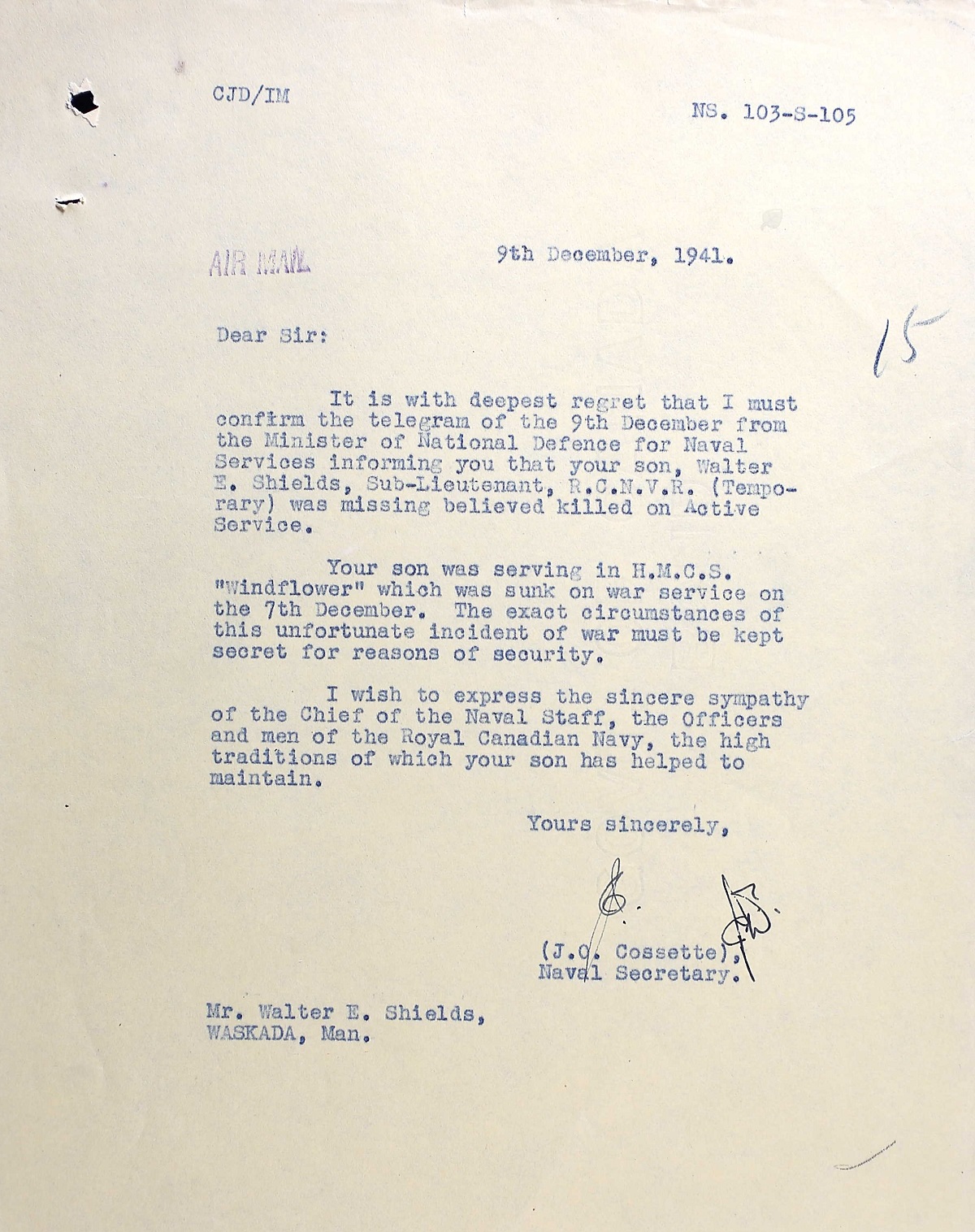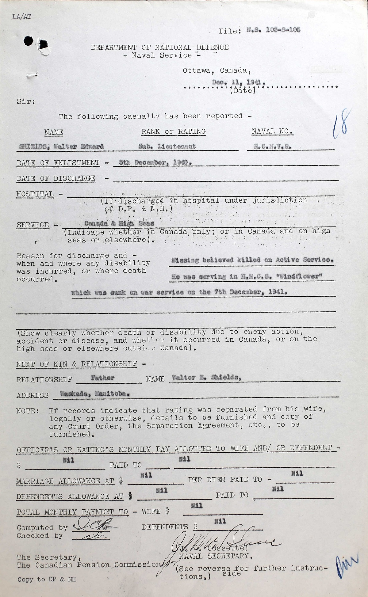 SHIELDS, Walter Edward, SLt, RCNVR, MPK - 07 Dec 1941, HMCS WINDFLOWER - Son of Walter Edward and Clara Evelyn Shields, of Waskada, MB.