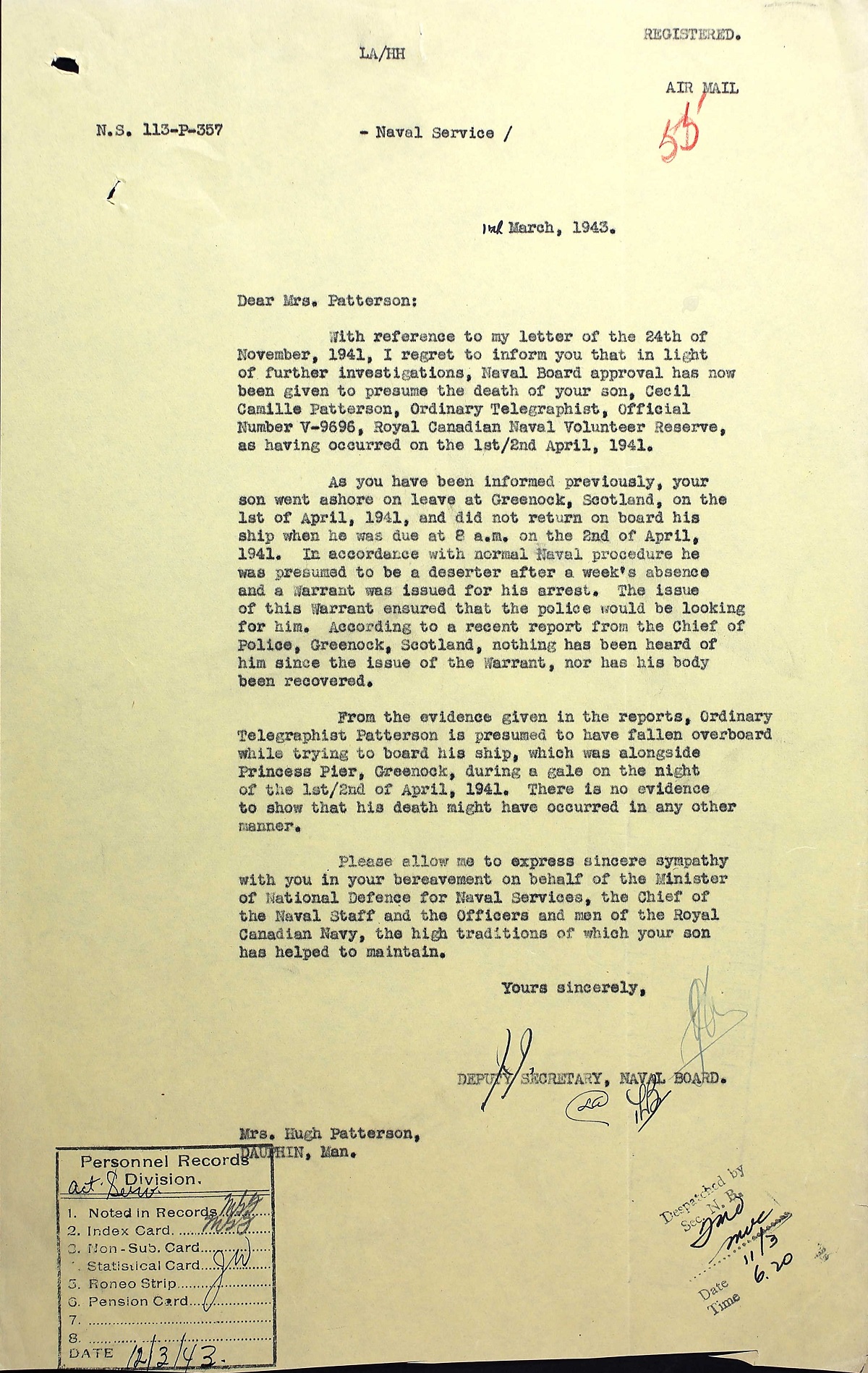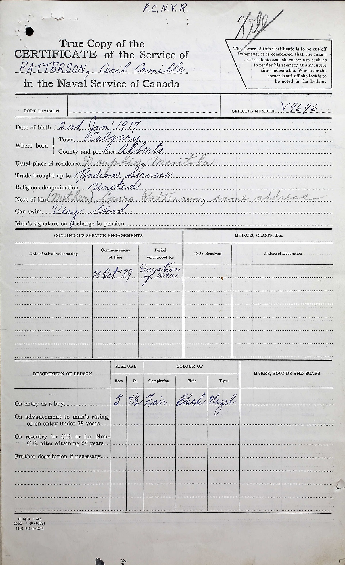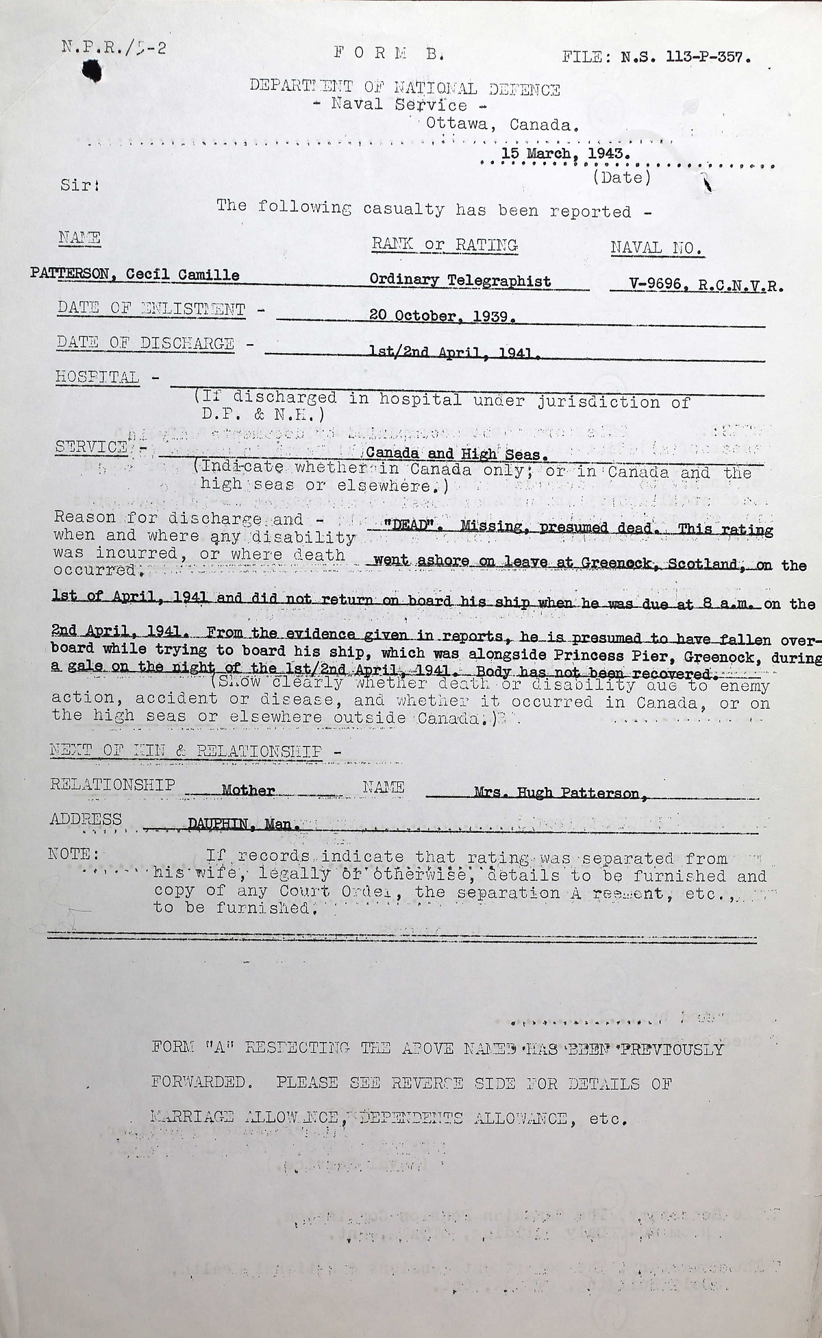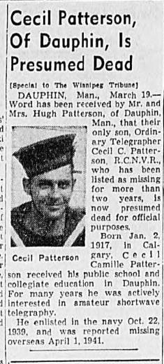 PATTERSON, Cecil Camille, O/Tel, V9696, RCNVR, MPK - 01 Apr 1941, HMCS WINDFLOWER -Son of Hugh and Laura Patterson, of Dauphin, MB.