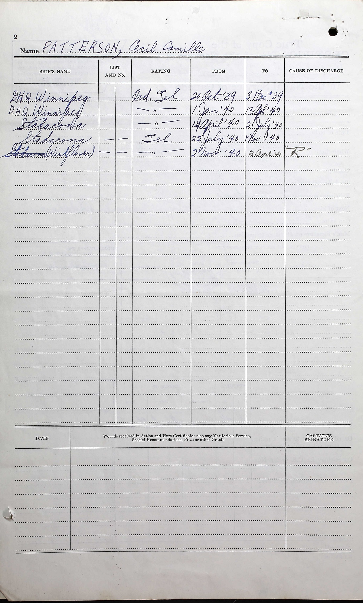 Ships served in: WINNIPEG DIVISION RCNVR - Enlisted 20 Oct 1939. Commenced Active Service 20 Oct 1939 as a O/Tel, RCNVR HMCS STADACONA - Drafted to STADACONA 17 Apr 1940 as an O/Tel, RCNVR * Rated Tel 22 Jul 1940 HMCS WINDFLOWER - Drafted to WINDFLOWER 02 Nov 1940 as a Tel, RCNVR
