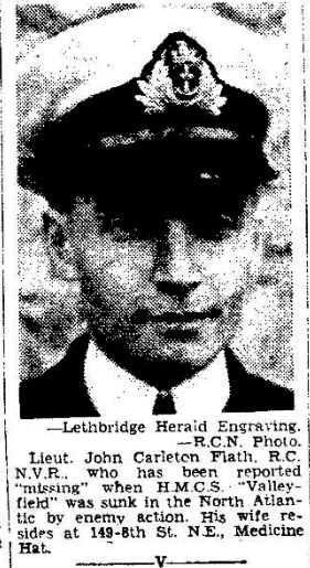 FLATH, John Carleton, Lt, RCNVR, MPK - 07 May 1944, HMCS VALLEYFIELD - Son of John Albert and Nelly Emiline Flath, of Medicine Hat, Alberta; husband of Nina Flath, of Medicine Hat.