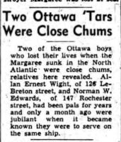 (NWE001) Article on the deaths of Allan Ernest Wight and Norman Wyndham Edwards, close friends, who were both drafted to HMCS MARGAREE (NWE002) Service file for Norman Edward // Source: The Library and Archives of Canada
