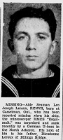 (LL01) Documents from the Service File of Leo Leroux (LL02) Article on AB Leroux reported missing when HMCS ESQUIMALT was sunk