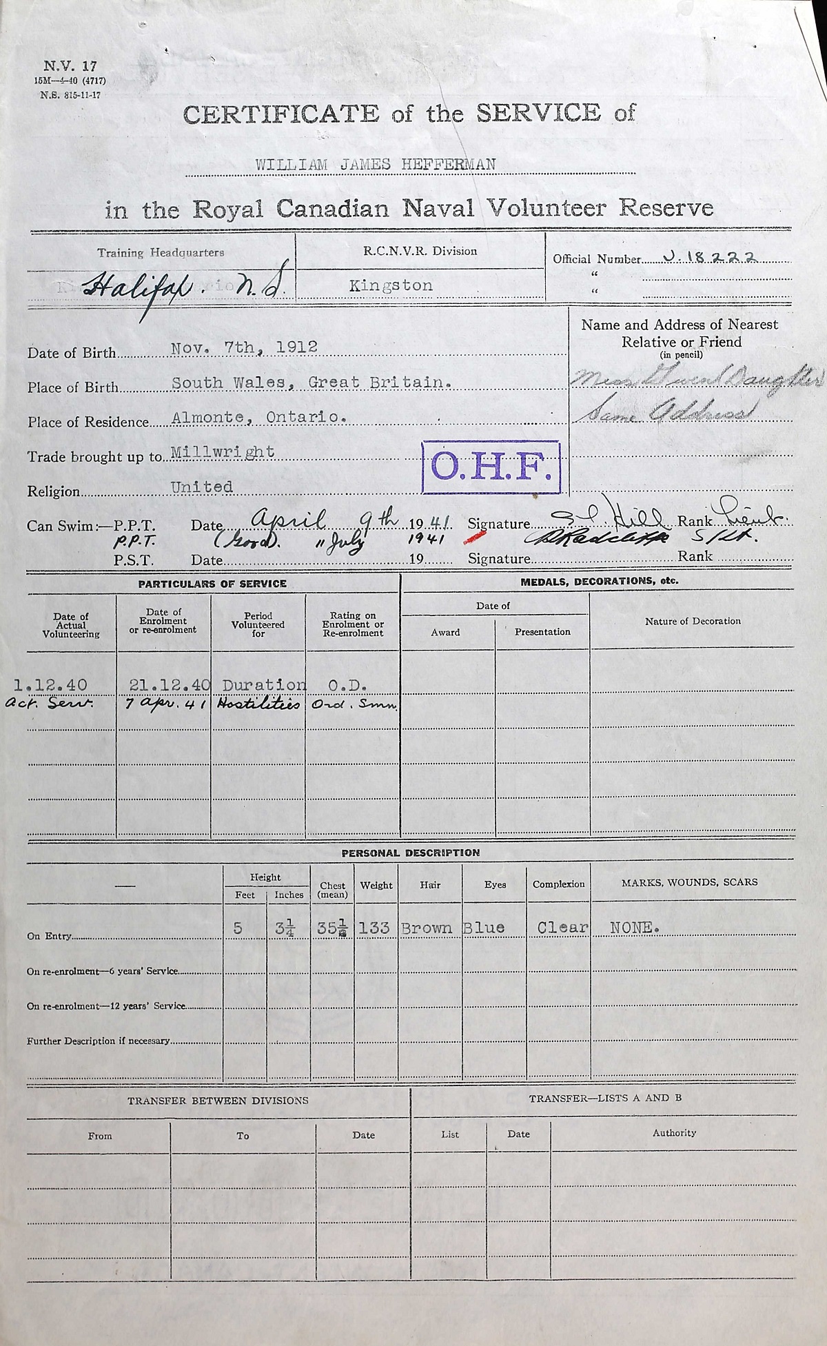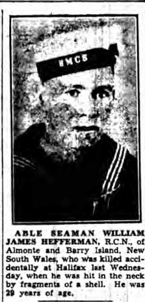 William Hefferman was born in Barry Island, Glamorgan, Wales. He immigrated to Canada in 1928 at the age of 15 and settled in Almont, Ontario, where he later met and married Laura Cochrane in 1937. Shortly after giving birth to their daughter Gwen, Laura died of acute pancreatitis. William raised his daughter, with the help of his sister-in-law, as a single father. In 1940 he joined the Navy. He served on HMCS ASSINIBOINE, being injured with her battle with U-210. After healing from his injuries, he was later drafted to HMCS SOREL. During a training exercise in which the starboard Oerlikon gun was being fired, a round from the Oerlikon struck the starboard brace of the fore yard which caused the round to detonate/explode - the shrapnel hitting AB Hefferman. The ship immediately returned to Halifax and William was taken ashore, however, he died of his wounds while in the ambulance enroute to the hospital.