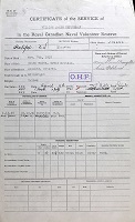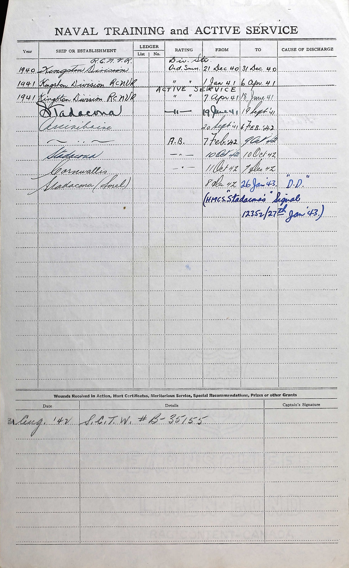 Ships served in: RCNVR DIVISION KINGSTON - Enlisted 21 Dec 1940. Commenced Active Service 07 Apr 1941 HMCS ASSINIBOINE - Served in ASSINIBOINE 20 Sep 1941 - 09 Oct 1942 as an OS an AB, RCNVR. Rated AB 07 Feb 1942 HMCS SOREL - Drafted to SOREL 08 Dec 1942 as an AB, RCNVR