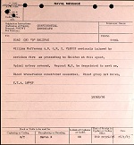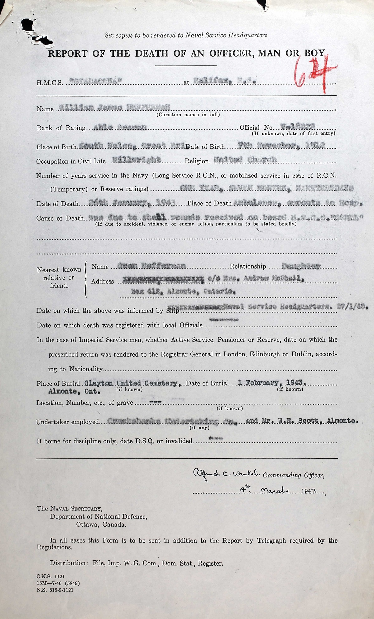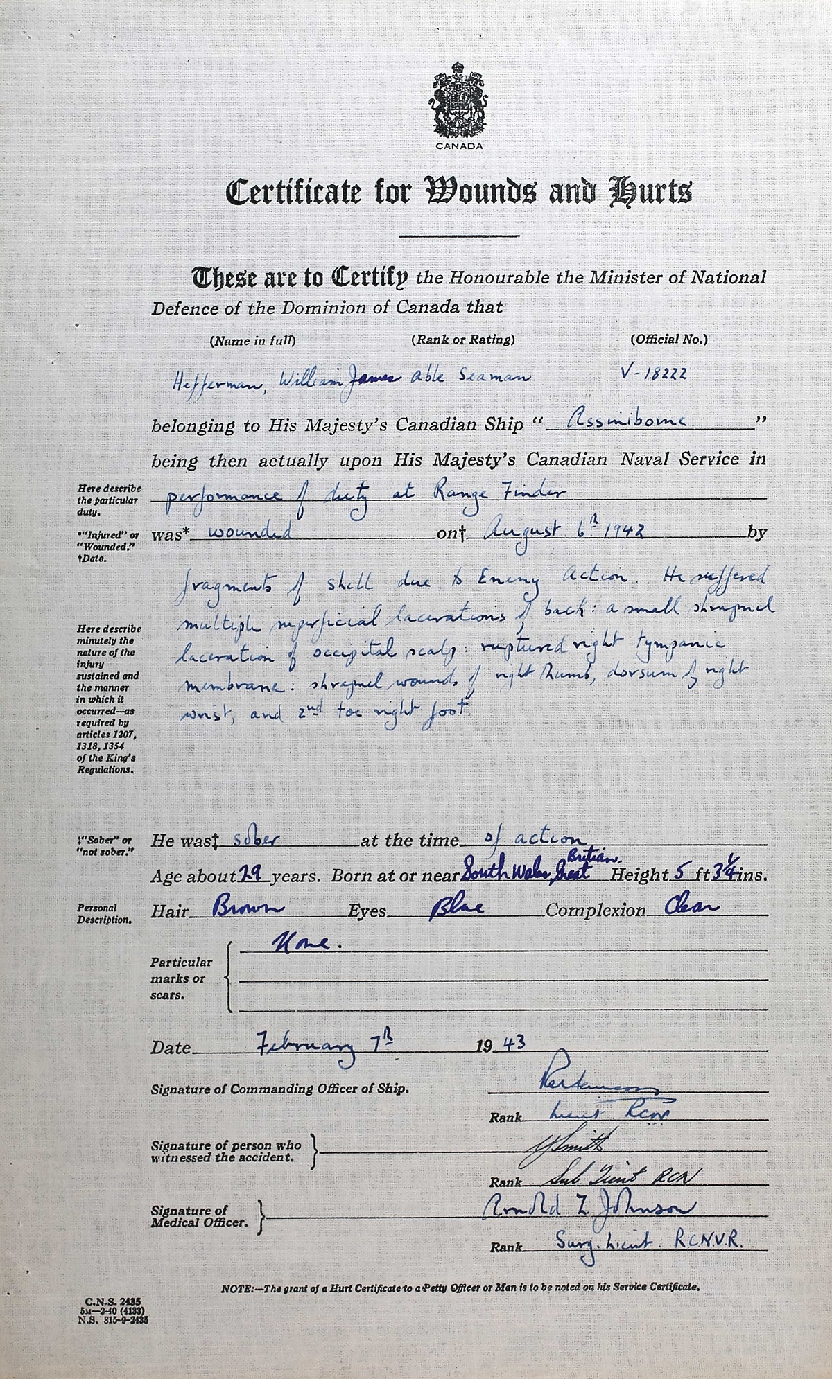 (WH01-WH02) Certificate of Service - pages 1 and 2 (WH03) Certificate of Wound or Hurt - from injury received on HMCS ASSINIBOINE during her battle with U-21- (WH04) Naval Message requesting MO meet SOREL on arrival (WH05) Report of Death