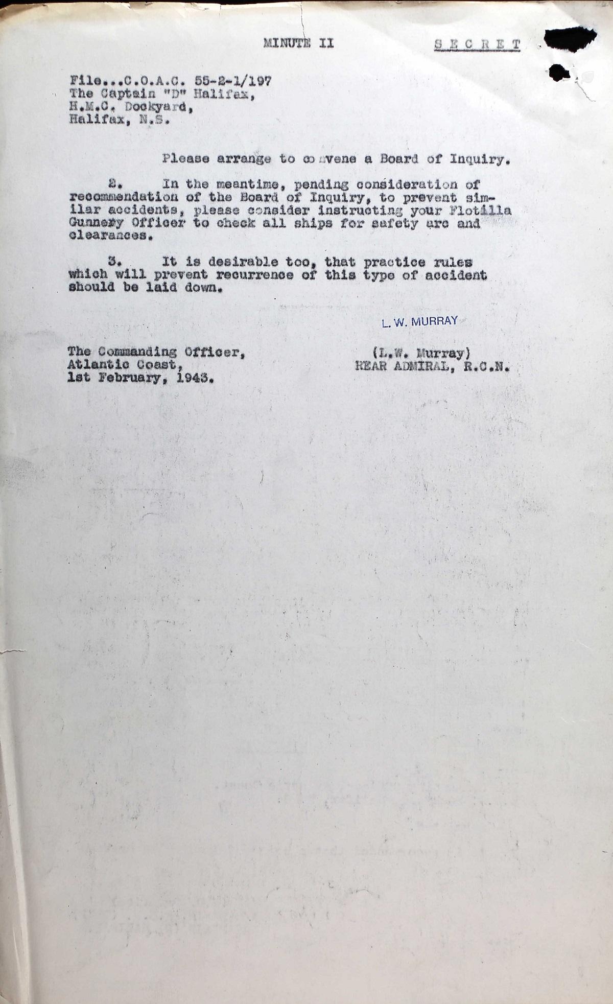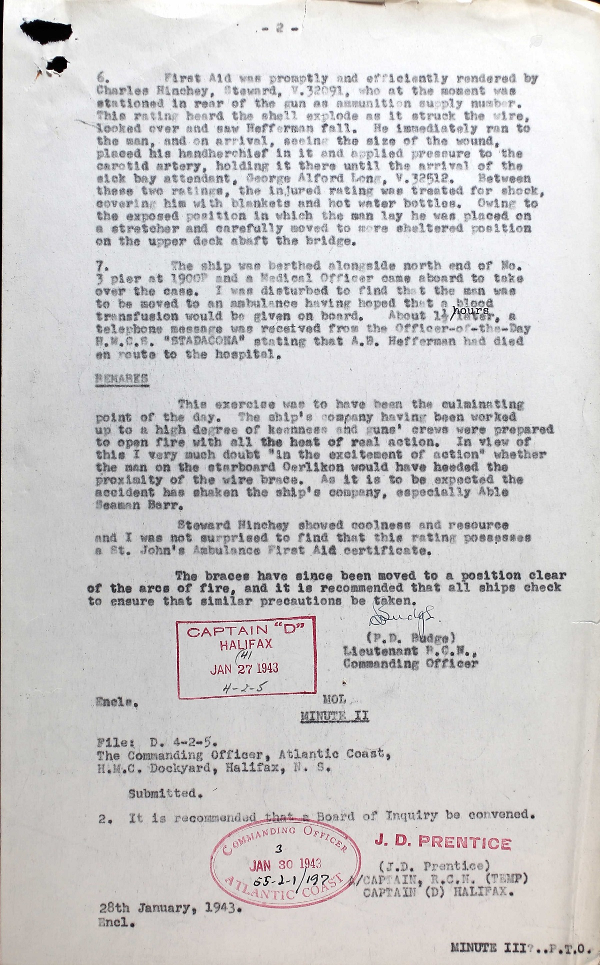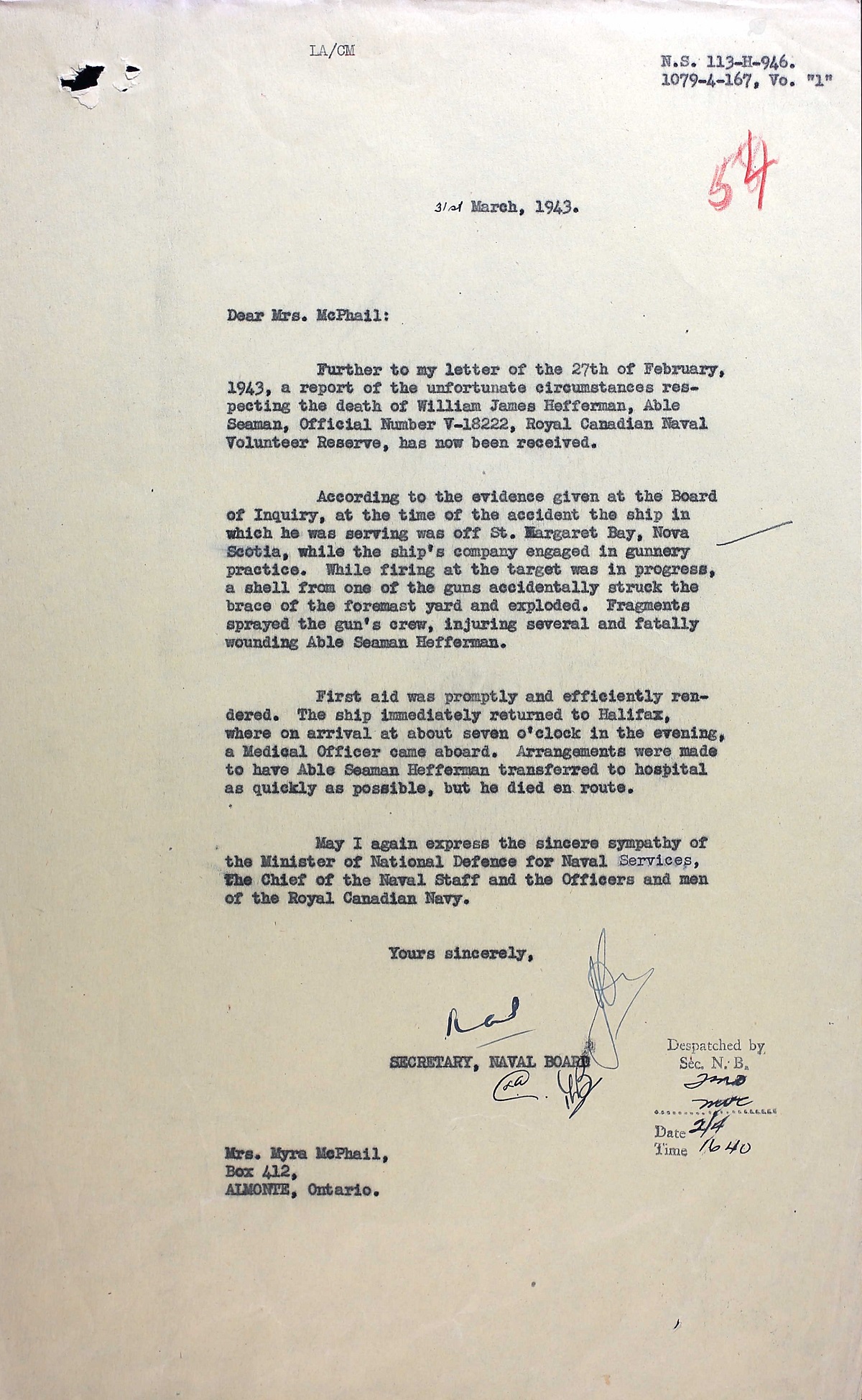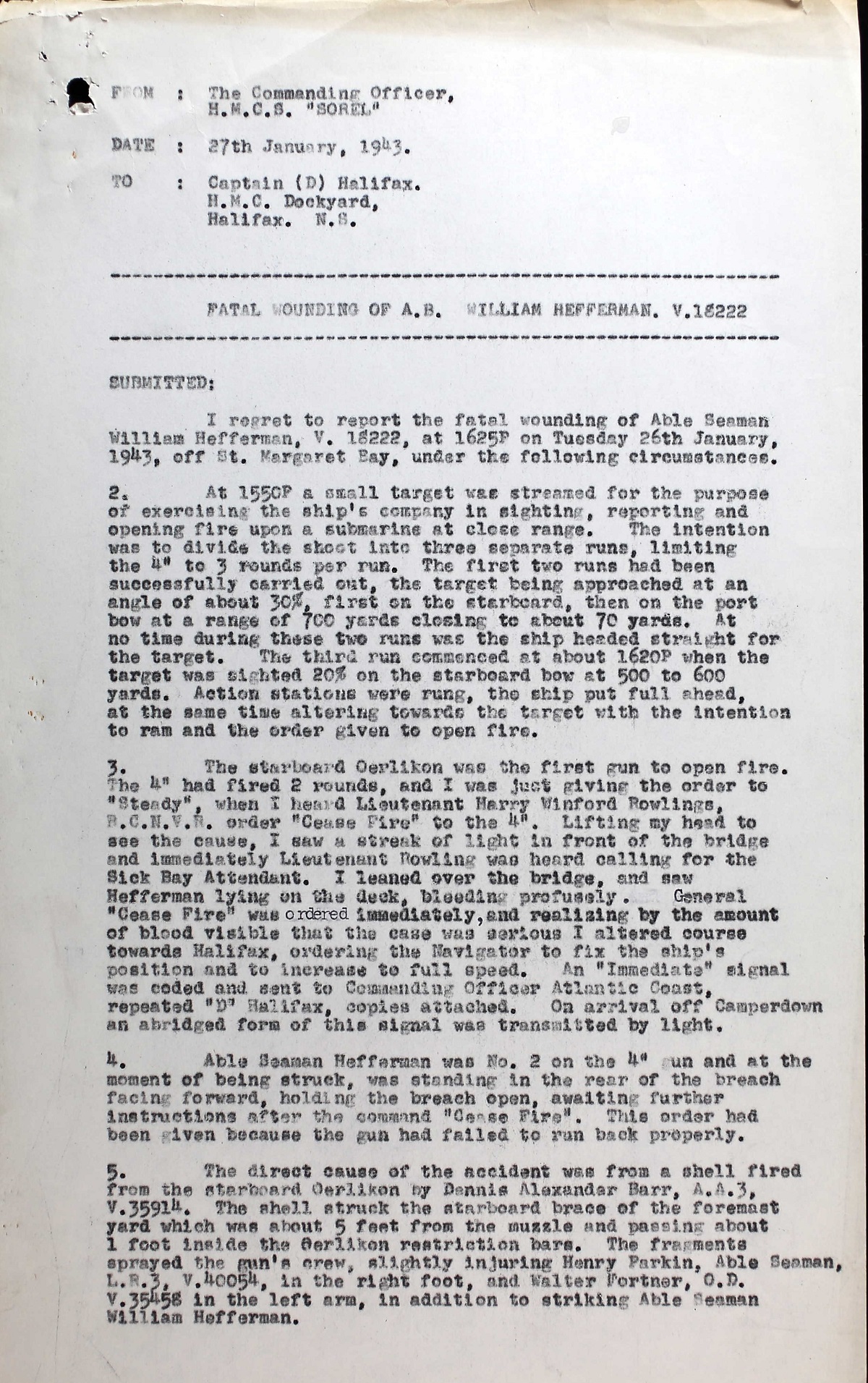 (WH06) Letter or William Hefferman's mother-in-law (WH07-WH09) HMCS SOREL'S Commanding Officer's Report on the death of AB Hefferman