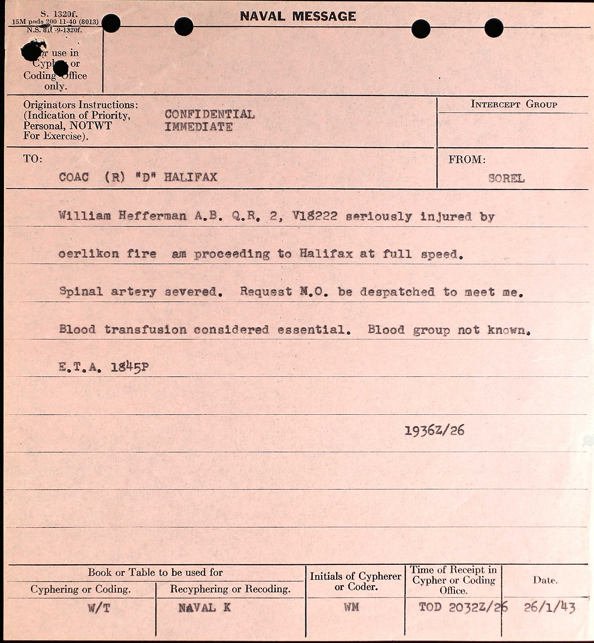 HEFFERMAN, William James, AB, V18222, RCNVR, Died - 26 Jan 1943, HMCS SOREL - Son of Eunice Hefferman, of Barry Island, Glamorgan, Wales