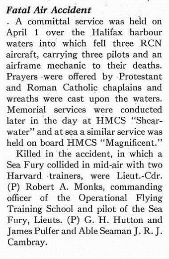 HUTTON, Glenn Hugh, Lt (P), O-35394, RCN, killed - 28 Mar 1949, HMCS SHEARWATER - Son of John and Edith Hutton of Edmonton, AB. Husband of Regina Hutton. Father of Glenn Hutton. Lt Hutton was buried at sea.