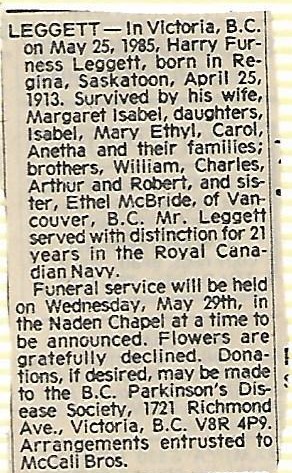 Harry Leggett joined the RCN on 04 Sep 1930 as a Boy Seaman.  He received the RCN Long Service and Good Conduct Medal on 16 Jun 1946.  He retired on 16 Jun 1952.