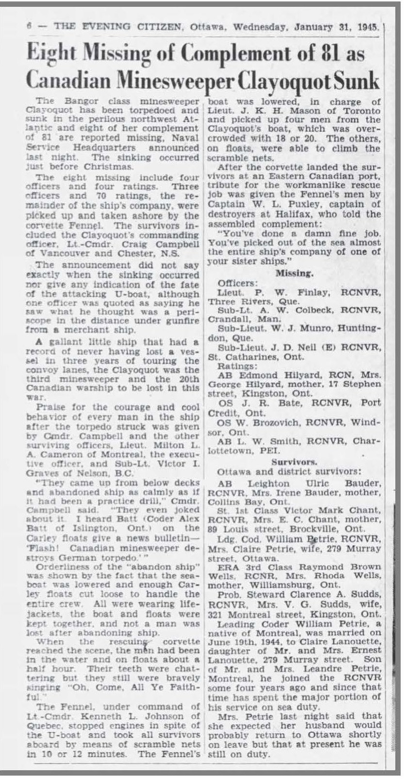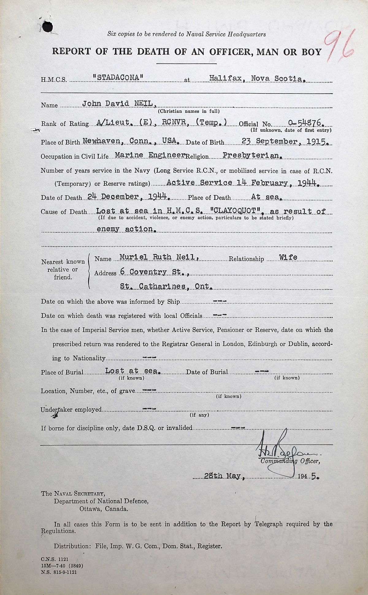 Lt John Neil and 3 other officers that were off watch were killed instantly as they slept in their bunks when HMCS CLAYOQUOT was hit by a gnat torpedoed frire from U-806. They were Lieut. Hall Finlay, Montréal, navigating officers: Sub-Lt. A. W. Colbeck of Hamiota, Manitoba. Sub-Lt. William Munro, Huntingdon, Québec, and Sub. Lt. John D. Neil, St. Catharines, Ont., the chief engineer.