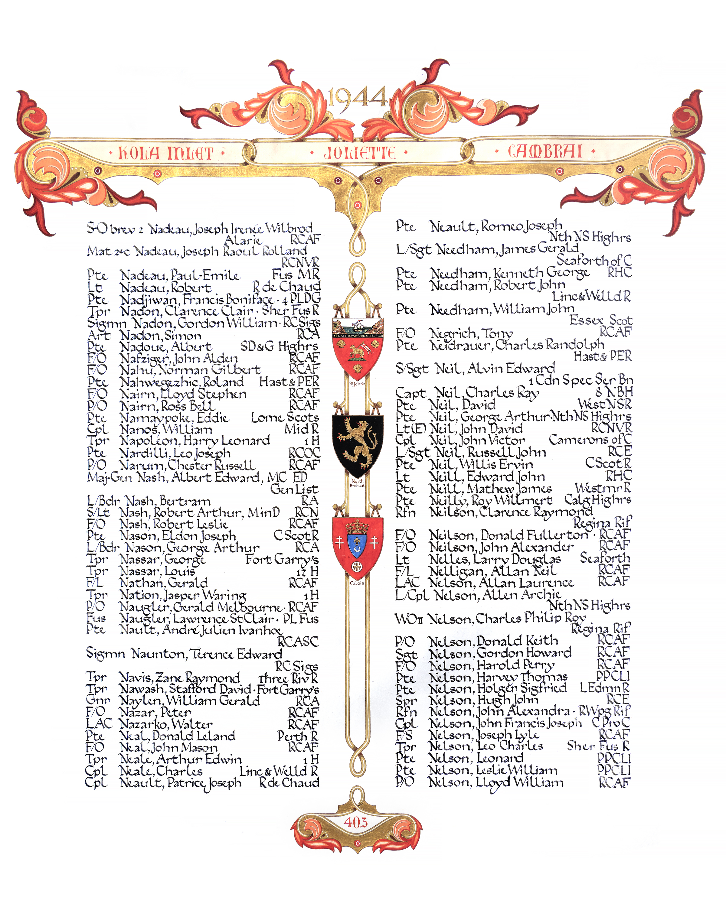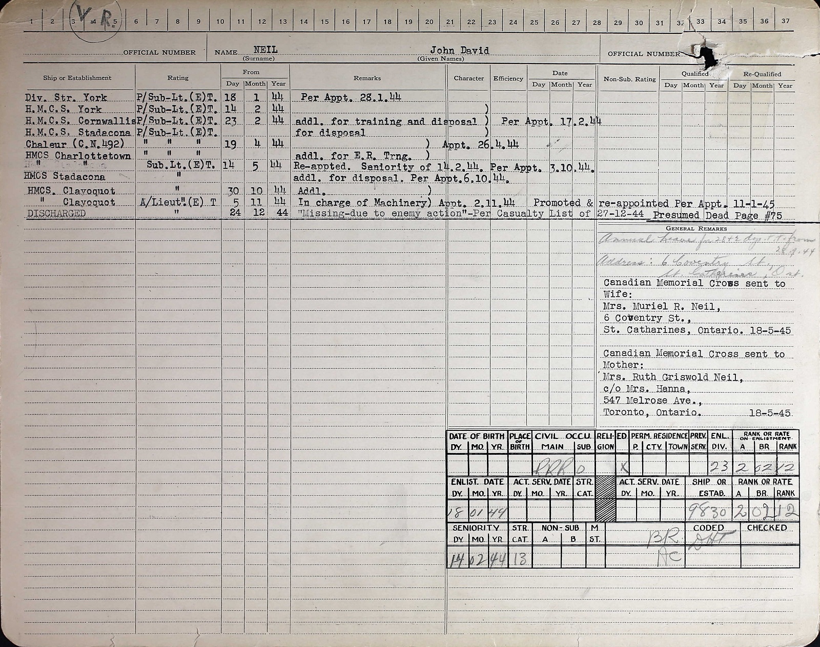 NEIL, John David, Lt (E), RCNVR, MPK - 24 Dec 1944, HMCS CLAYOQUOT - Son of James Stephen and Ruth Neil, of Toronto, ON; husband of Muriel Ruth Neil, of St. Catharines, ON.