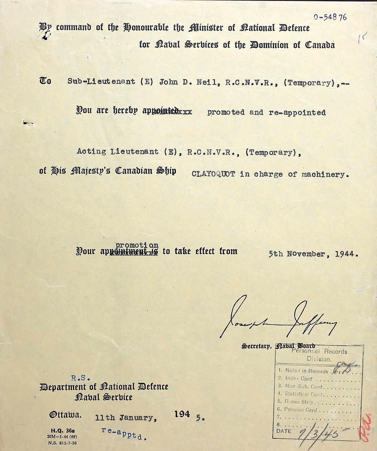 Ships served in: HMCS YORK - Enlisted 18 Jan 1944. Commenced Active Service 14 Feb 1944 HMCS CHALEUR - Appointed to CHALEUR 19 Apr 1944 as a Prob SLt (E), RCNVR HMCS CHARLOTTETOWN - Appointed to CHARLOTTETOWN 19 Apr 1944 as a Prob. SLt (E), RCNVR add'l for E.R. training. Appointed SLt (E) 14 May 1944 HMCS CLAYOQUOT - Appointed to CLAYOQUOT 30 Apr 1944 as a SLt (E), RCNVR. Appointed Lt (E), RCNVR 05 Nov 1944