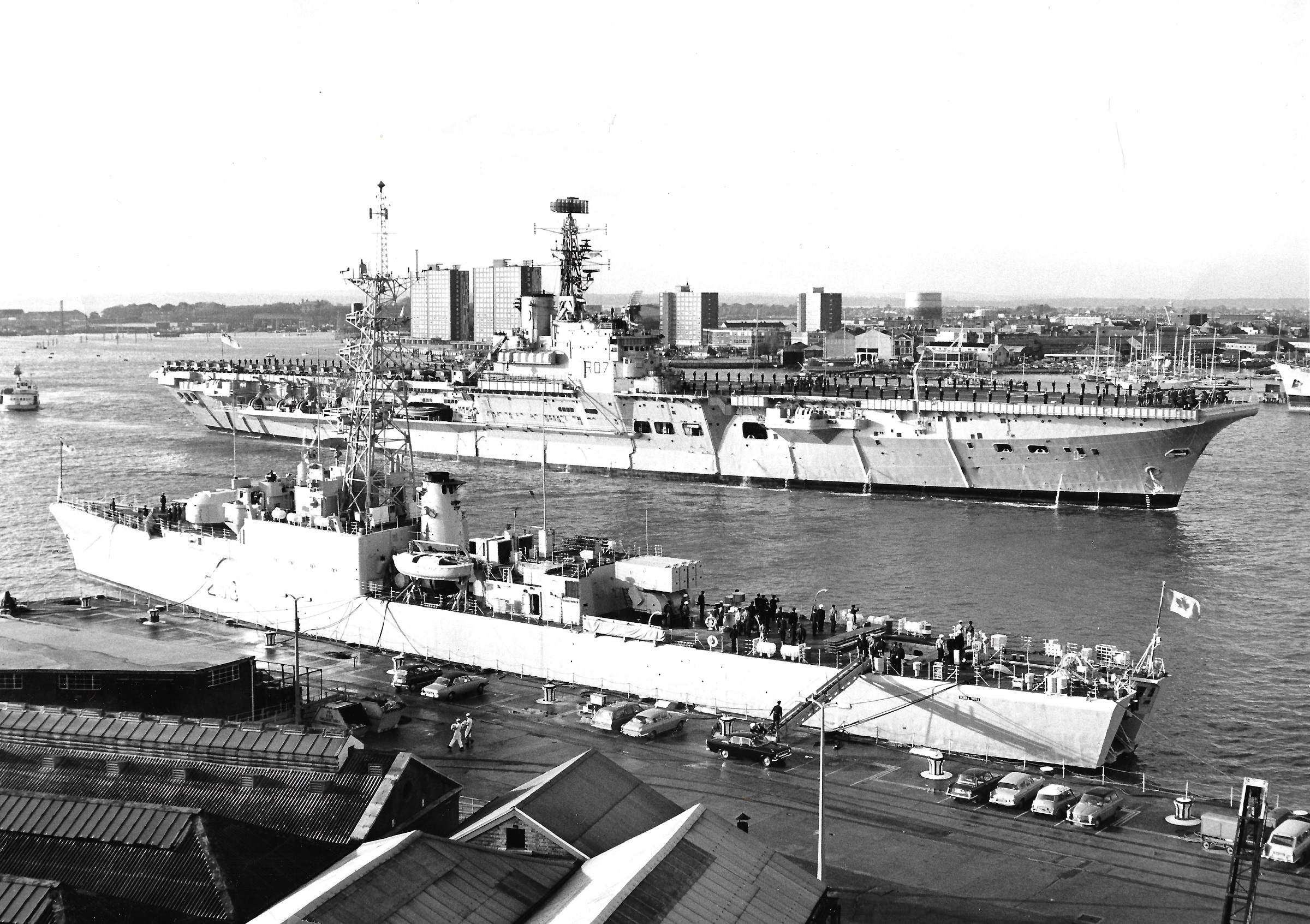 (PMc21) HMCS TERRA NOVA 259 alongside with HMCS ARK ROYAL R07 sailing past in the harbour (PMc22) 50TH Anniversary of the RCN collage