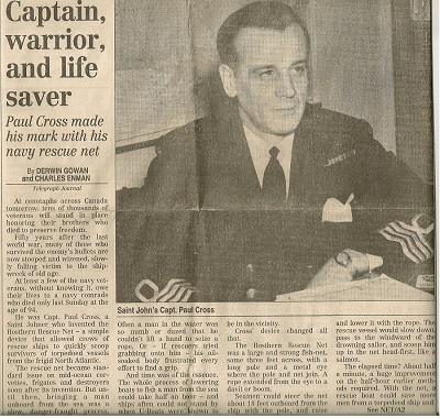 Article on the death of Capt. Paul Cross The Saint John Telegraph Journal 10 Nov 1994 click on the above article to view a larger image