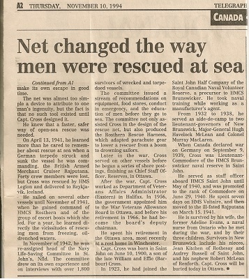 Article on the death of Capt. Paul Cross The Saint John Evening Times Globe 10 Nov 1994 click on the above article to view a larger image