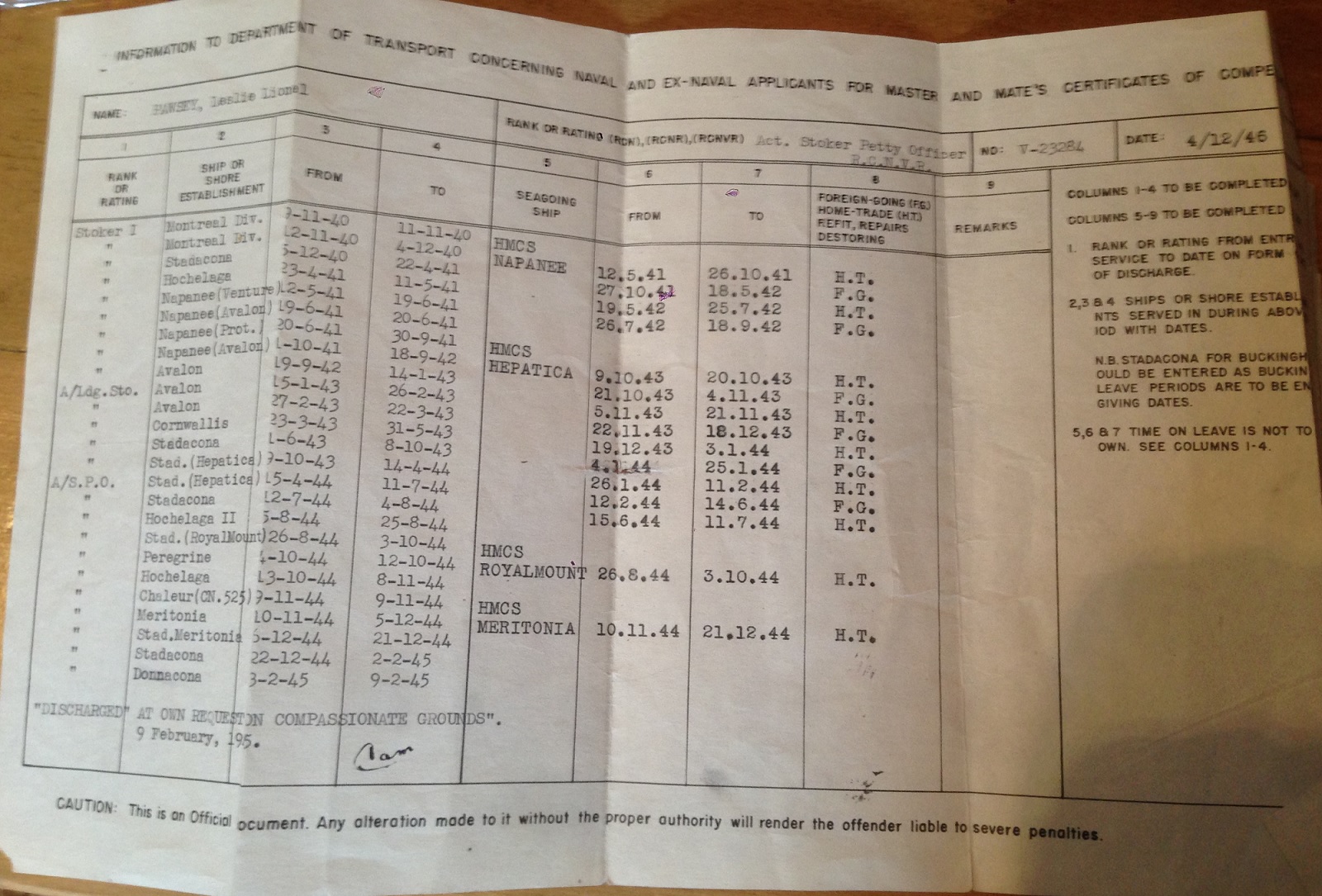 Ships served in: MONTREAL DIVISION RCNVR - Enlisted 09 Nov 1940. Commended Active Service 12 Nov 1940 HMCS NAPANEE - Served in NAPANEE 12 May 1941 - 18 Sep 1942 HMCS HEPATICA - Served in HEPATICA 09 Oct 1943 - 11 Jul 1944 HMCS ROYALMOUNT - Served in ROYALMOUNT 26 Aug 1944 - 03 Oct 1944 HMCS MERRITTONIA - Served in MERRITTONIA 10 Nov 1944 - 21 Dec 1944 HMCS DONNACONA - Served in DONNACONA 03 Feb 1945 - 09 Feb 1945
