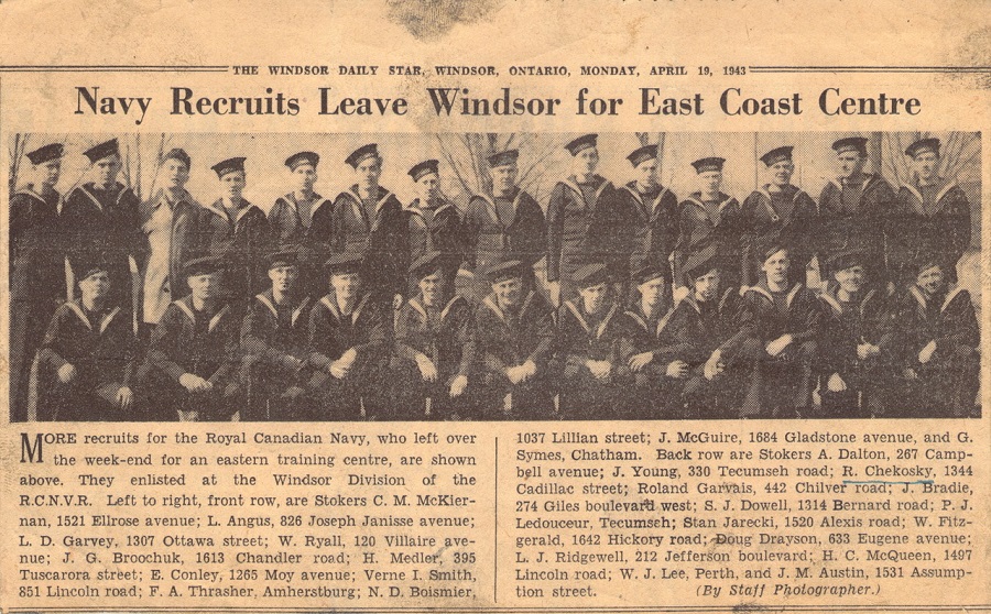 Back row: Stokers A. Dalton, J. Young, R. Chekosky, Roland Garvais, J. Bradie, S.J. Dowell, P.J. Ledouceur, Stan Jarecki, W. Fitzgerald, Doug Drayson, L.J. Ridgewell, H.C. McQueen, W.J. Lee, J.M. Austin