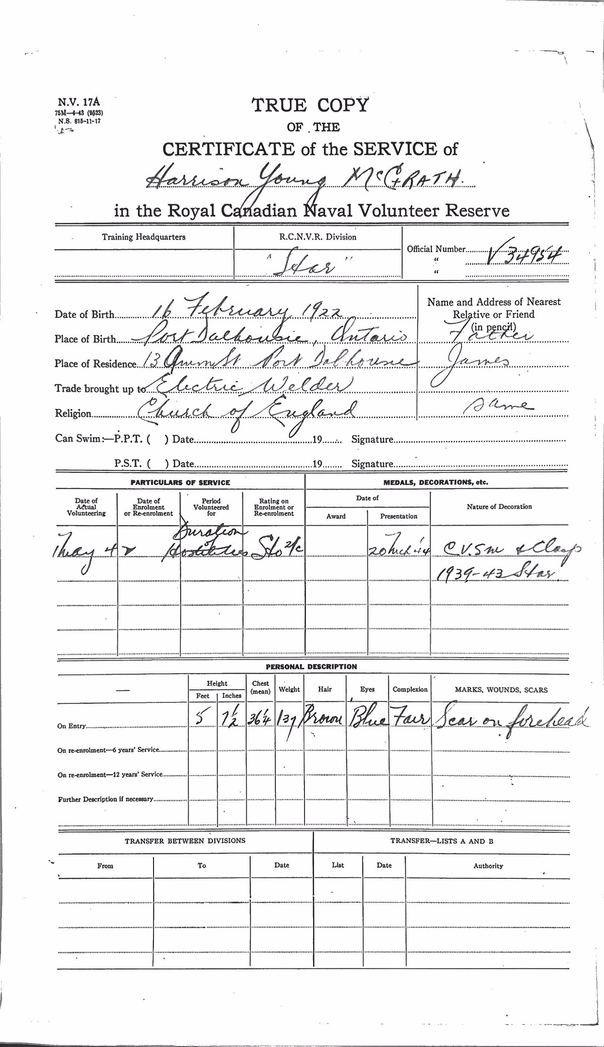 HMCS STAR - Enlisted 02 May 1942 as a Sto 2c.  Commenced Active Service 02 May 1942