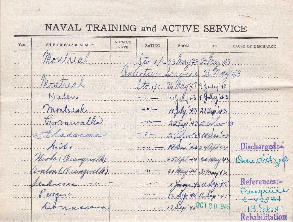 HMCS MONTREAL - Enlisted as a Sto 1c 25 May 1943. Commenced Active Service 26 May 1943