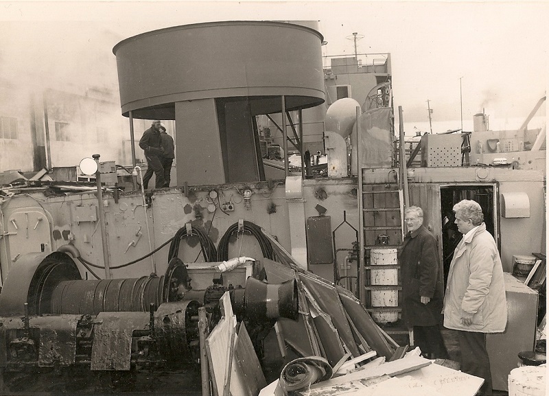 Bill Bruce, on the right in light coloured coat, aboard HMCS SACKVILLE. Bill was involved with restoring the ship to it's original Second World War configuration to ready it as a floating museum in Halifax. The after gun tub (aka bandstand) had just been installed.