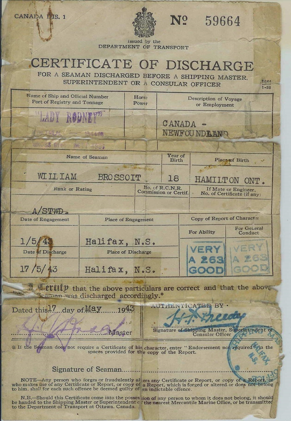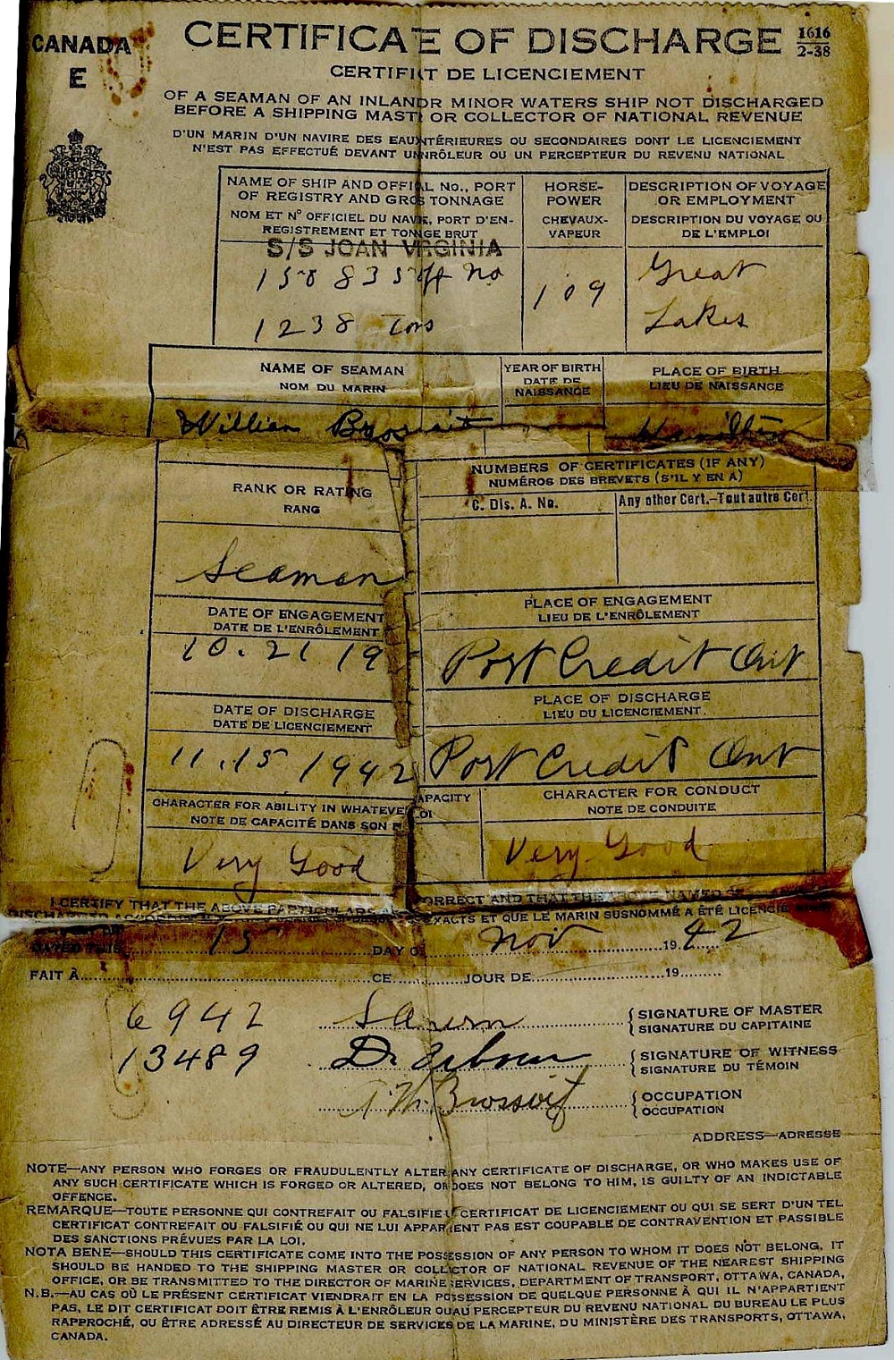 (WB01) William's Certificate of Discharge from the merchant ship SS Joan Virginia on 15 Nov 1942 (WB02) William's Certificate of Discharge from the SS Lady Rodney on 17 May 1943 (WB03) Ruby and William (WB04) Page one of William's Certificate of Service for the RCNVR (WB05) William's medals - Canadian Volunteer Service Medal and the War Medal 1939-1945