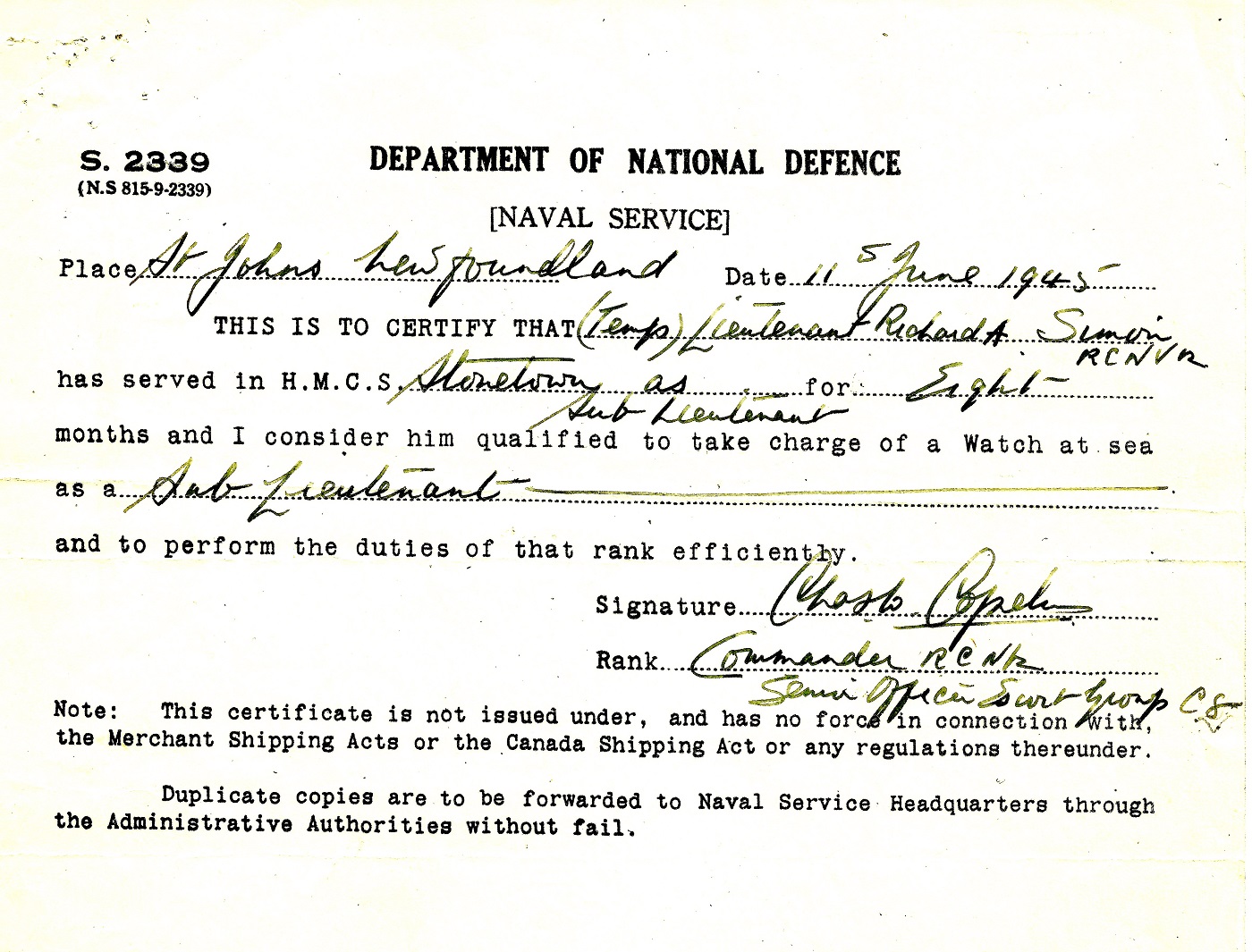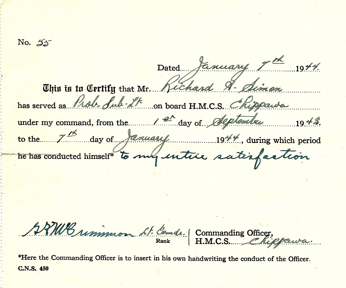 (RS01) Portrait of SLt Richard Simon (RS02) Flimsie for Prob SLt Simon at HMCS CHIPPAWA dated 07 Jan 1944 (RS03) Flimsie for Prob SLt Simon, RCNVR at HMCS KINGS dated 18 Jun 1944 (RS04) Flimsie for Lt Simon, RCNVR on HMCS STONE TOWN from 18 Apr 1945 to 10 Aug 1945 (RS05) Flimsie for Lt Simon, RCNVR on HMCS STONE TOWN dated 11 Jun 1945