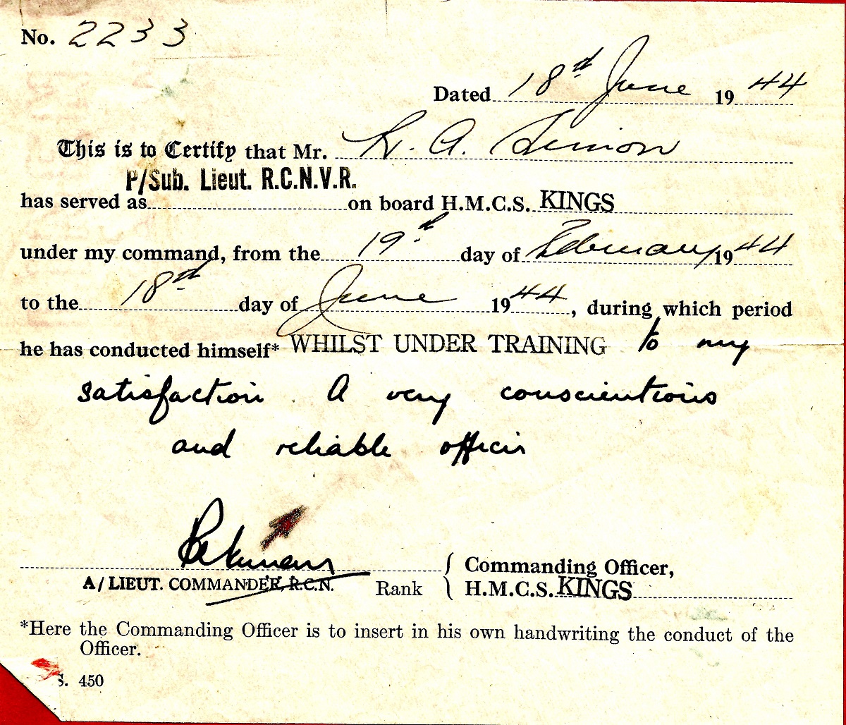 Ships served in: HMCS CHIPPAWA - Appointed to CHIPPAWA 21 Sep 1943 as a Prob. SLt, RCNVR (Navy List Oct 1943) HMCS KINGS - Appointed to KINGS For Disposal or Under Training 07 Jan 1944 as a Prob. SLt, RCNVR (Navy List Feb 1944). Appointed SLt, RCNVR (seniority 16 Jun 1944) (Navy List Jun 1944) HMCS STONE TOWN - Appointed to STONE TOWN 19 Jun 1944 as a SLt, RCNVR. (Navy List Jul 1944). Commissioning crew. Seniority backdated to 09 Jun 1944 (Navy List Sep 1944) Appointed Lt, RCNVR 18 Apr 1945 (Flimsie dated 10 Aug 1945) * Retired List as a Lt, RCN(R) (seniority 09 Jun 1945) HMCS YORK (Retired List) as a Lt, RCN(R) (Navy List Jul 1952). Last noted on the Retired List at HMCS YORK as a Lt, RCN(R) (seniority 09 Jun 1945) (Navy List Jan 1960)