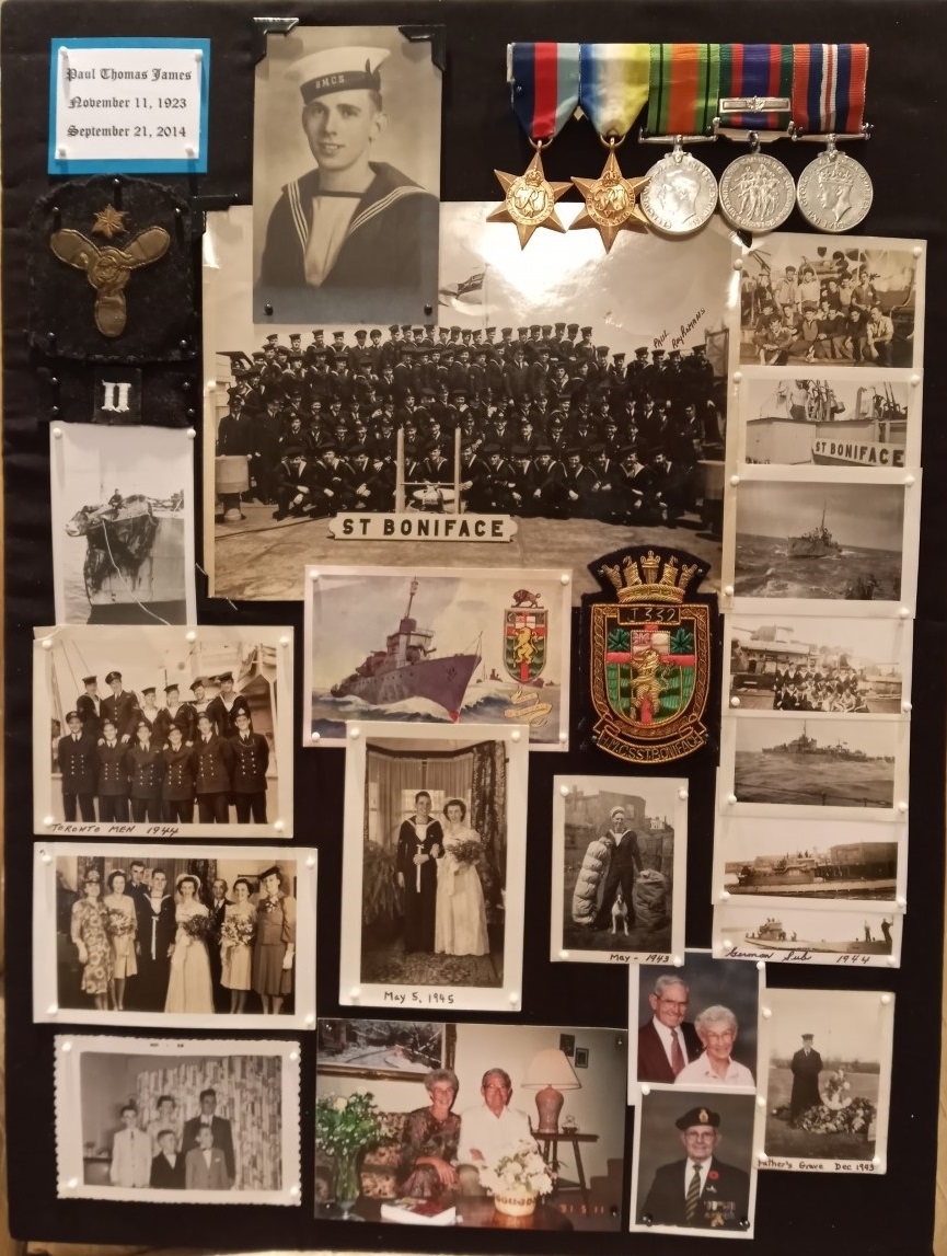 JAMES, Paul Thomas - WWII Veteran - Royal Canadian Navy; Member of the Royal Canadian Legion, Branch 488, Brechin Suddenly at the Orillia Soldiers' Memorial Hospital on Sunday, September 21, 2014, at the age of 90. Paul James, of Orillia and formerly of Big Cedar Estates, beloved husband of the late Sheila Jessie James (nee Davidson) Special companion of Marj McCurrach. Loving father of David (Joanne) of Markham, Gary (Patricia) of Cobourg, Brian (Wendie) of Mississauga. Grandfather of Mathew (Beverley), Steven (Colleen), Mark (Ashley), Adam (Wynne), Erin (Stephen), Tracy (Patrick), Tara (Keith) and great-grandfather of 14. Brother of the late Marjorie Warner. Lovingly remembered by nieces and nephews. The late Mr. Paul James will rest at the Mundell Funeral Home, 79 West St. N., Orillia on Thursday from 2-4 and 7- 9 p.m. Funeral Service in the chapel on Friday morning, September 26th at 11 o'clock. Interment St. Andrew's- St. James' Cemetery, Orillia. If desired, memorial donations to the charity of your choice would be gratefully appreciated. (The Toronto Star 24 Sep 2014)