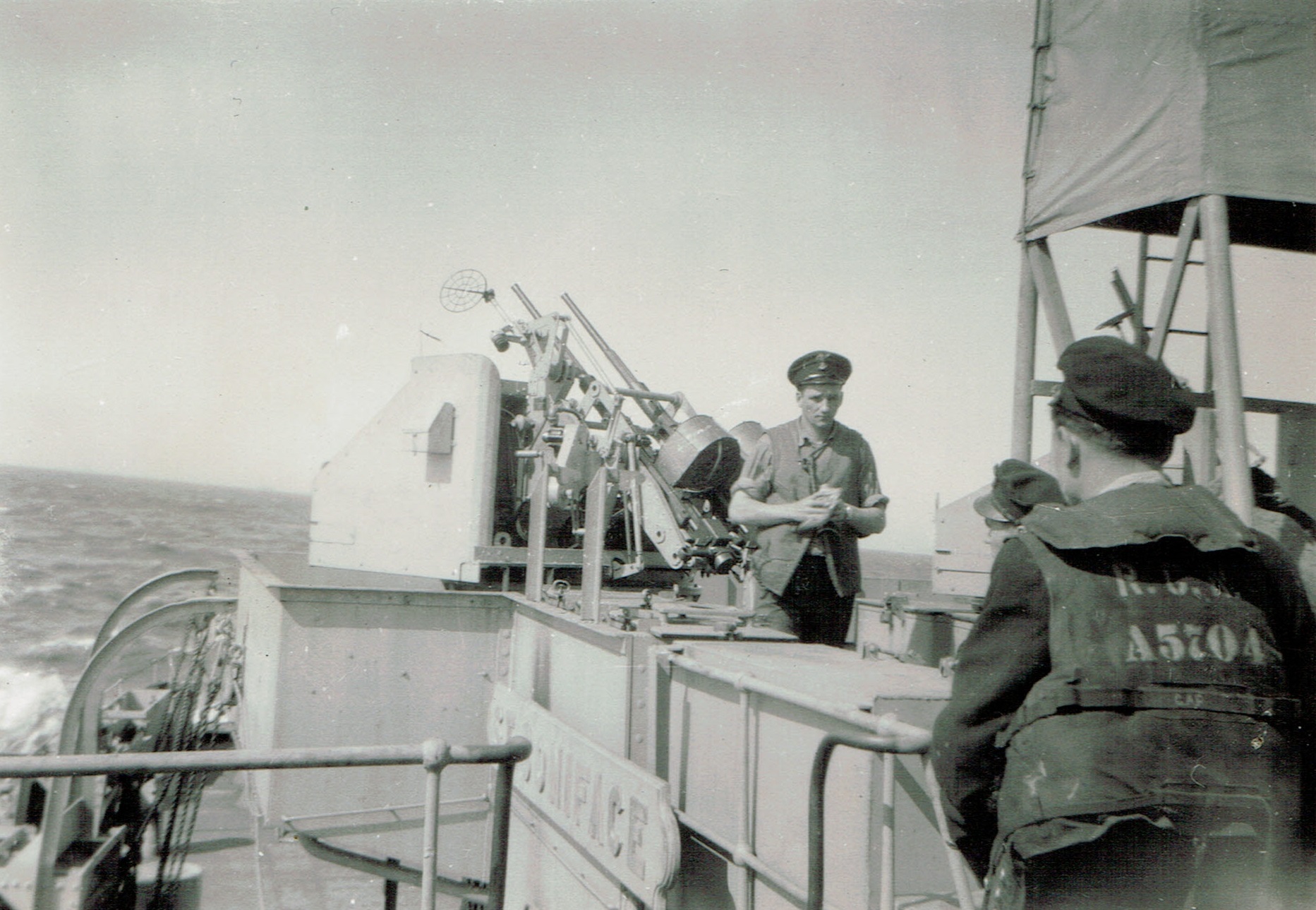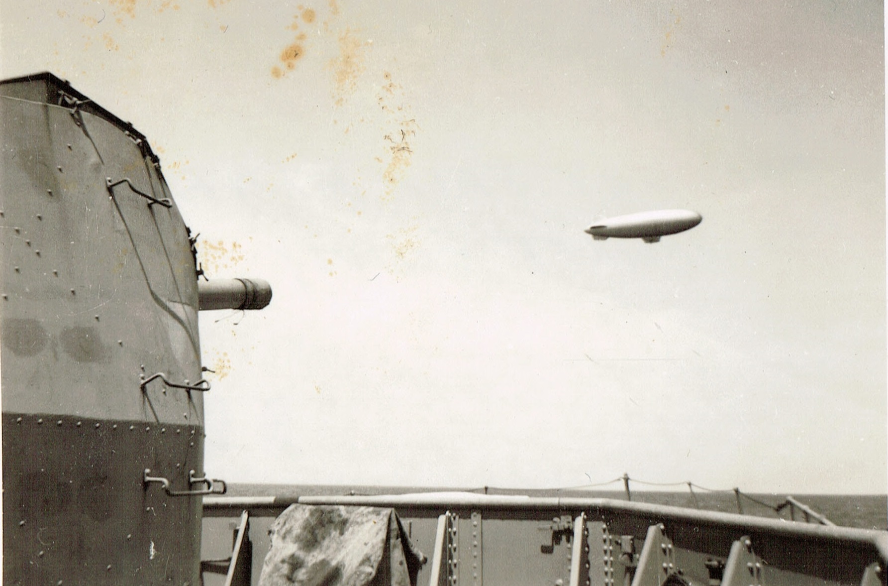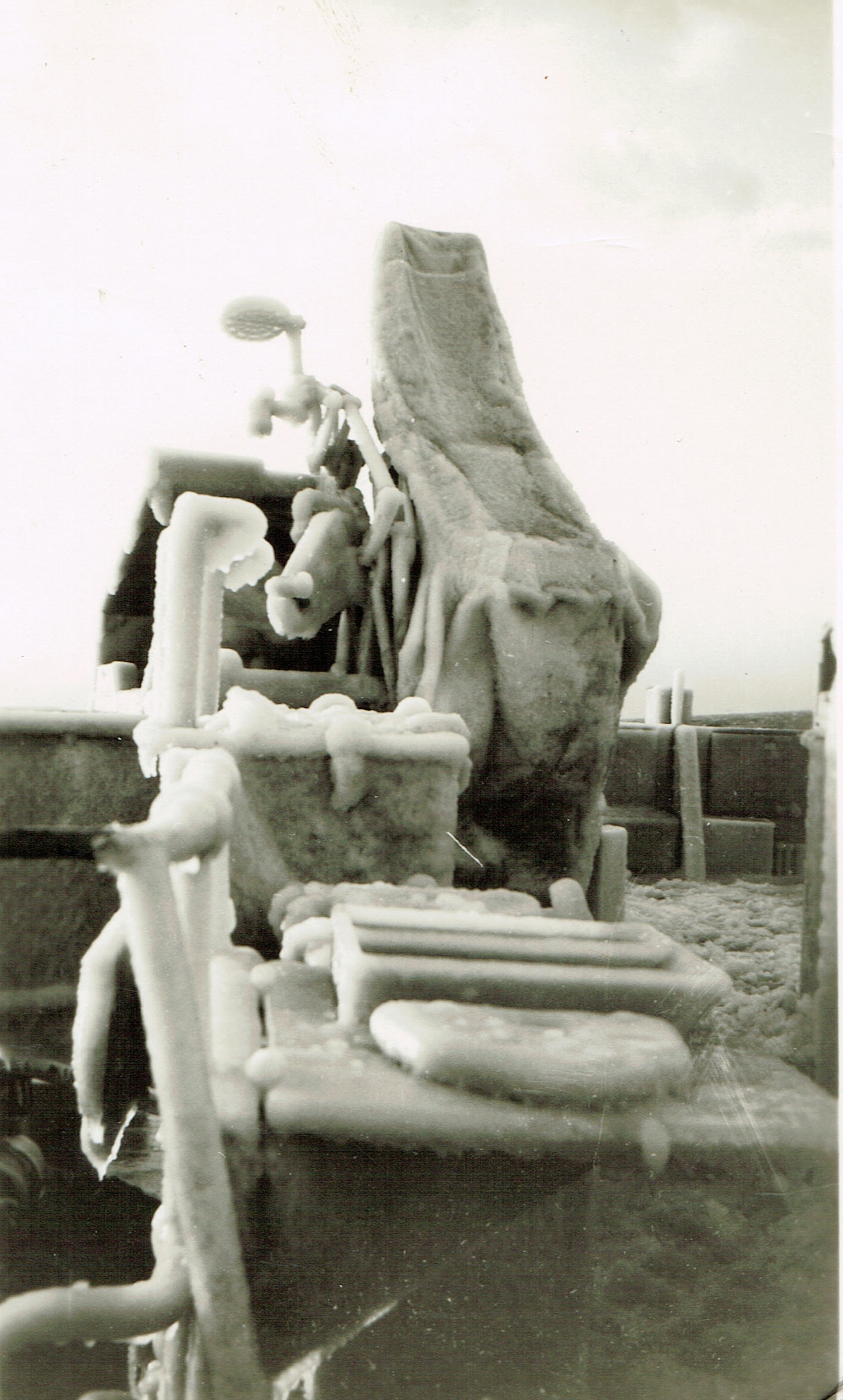 (PJ09) Paul James on HMCS ST BONIFACE J332 just forward of the after gun mount PJ10) USN Blimp searching for U-boats (PJ11) Paul James with shipmates on HMCS ST BONIFACE J332 (PJ12-PJ13) HMCS ST BONIFACE J332 iced-up all the way to New York