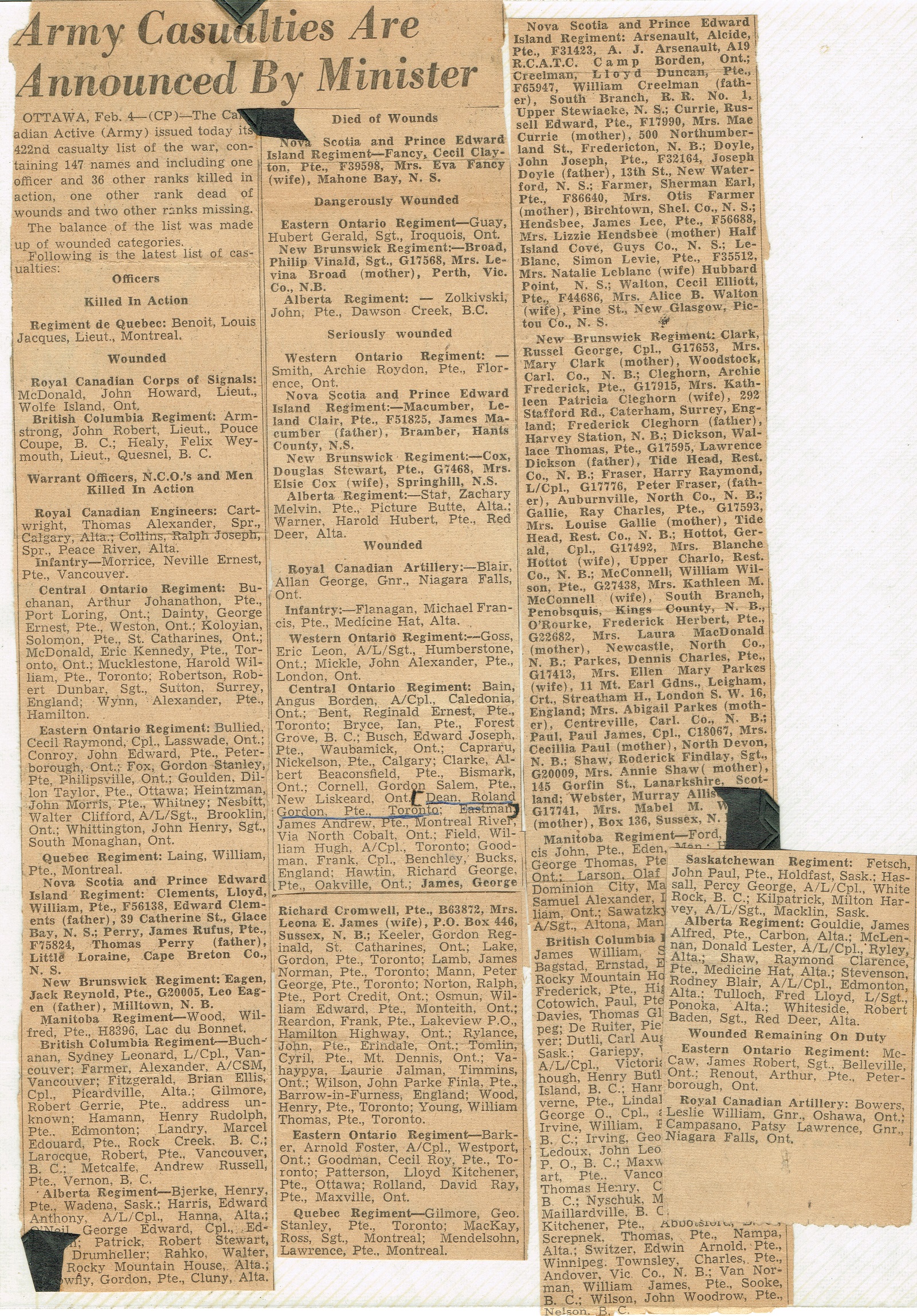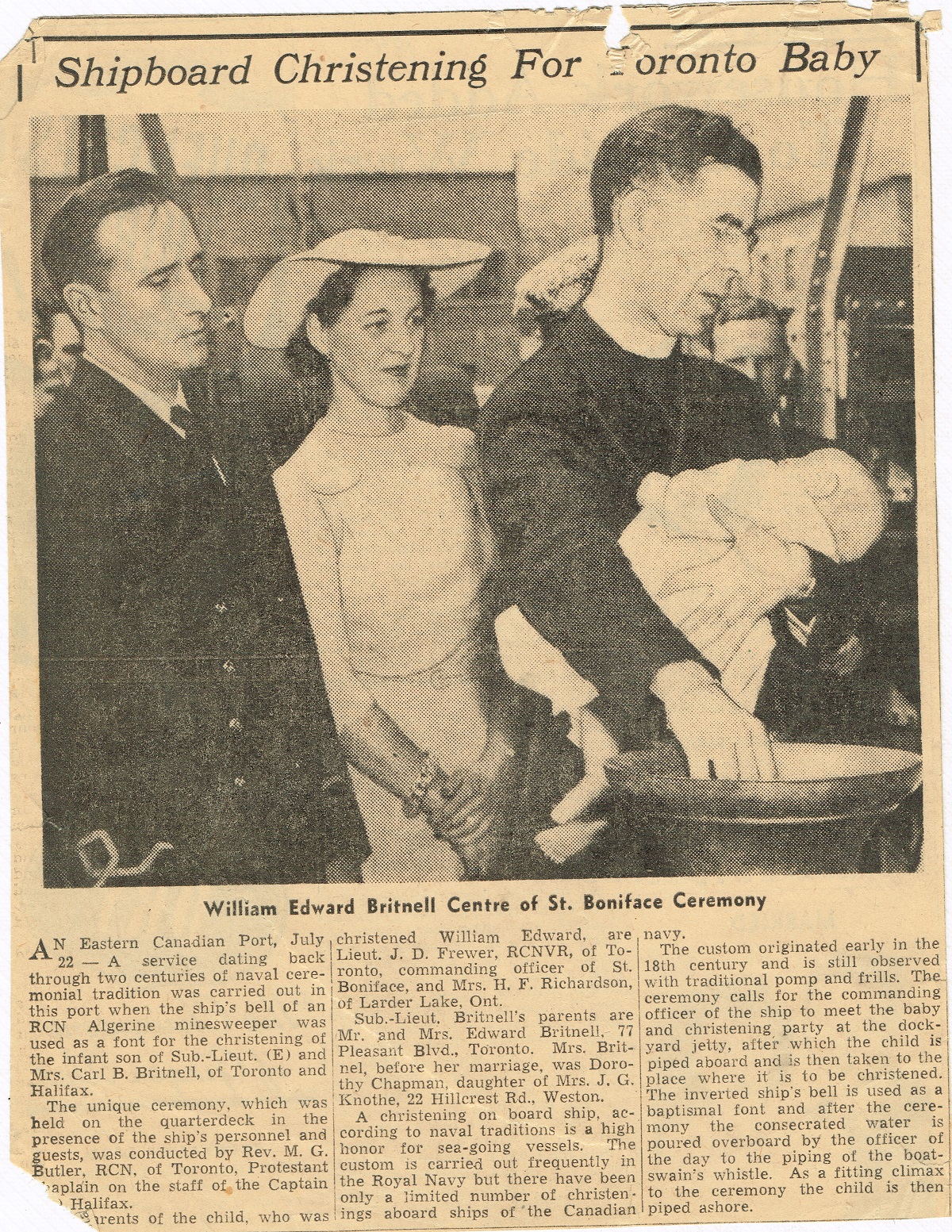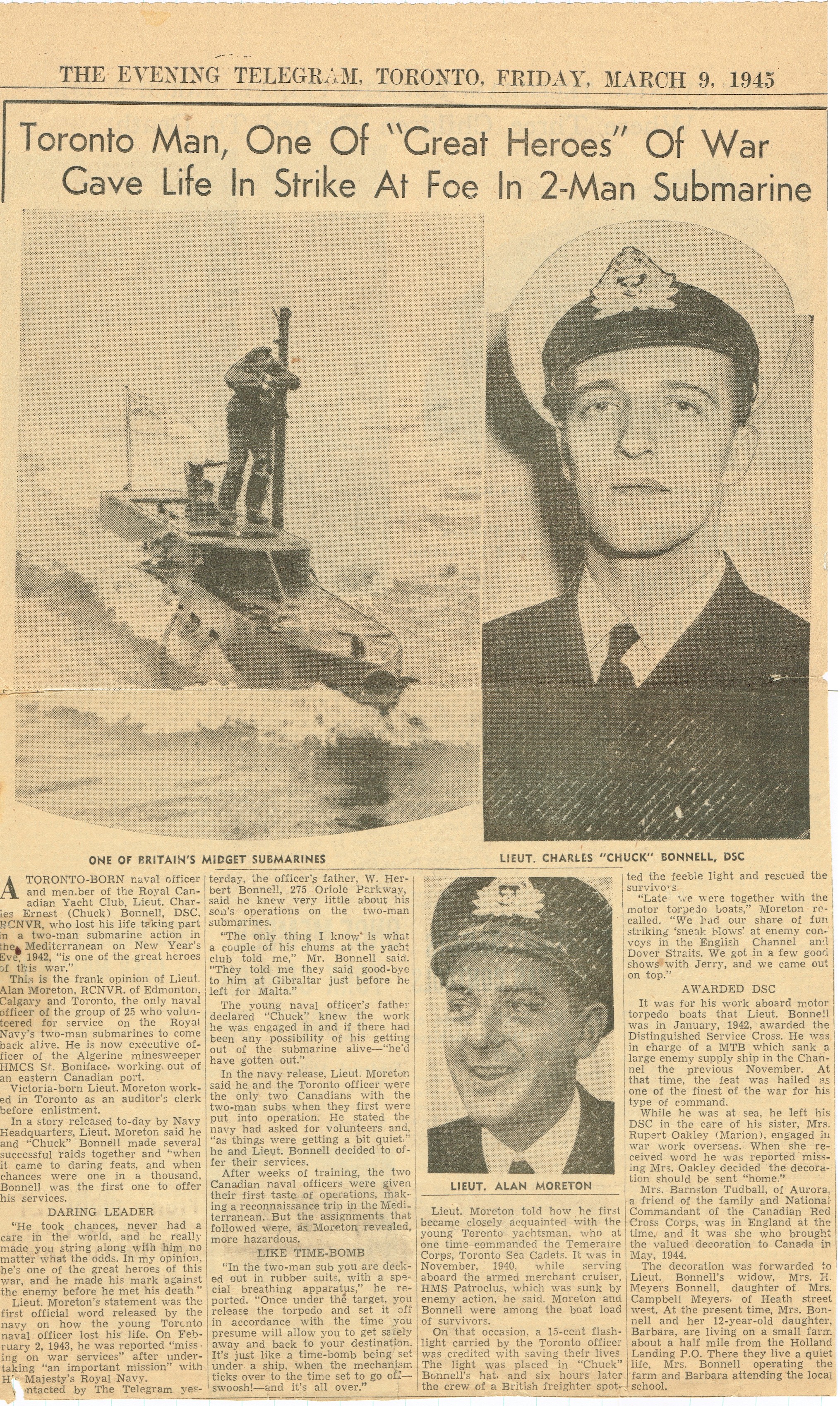 (PJ62) Article on the death of Lt Charles Bonnell DSC recounted by Lt Alan Moreton - The Evening Telegram, Toronto - 09 Mar 1945 (PJ63) William Edward, son of SLt (E) and Mrs. Carl B. Britnell christened on ship (PJ64) Army Casualties are Announced by Minister