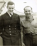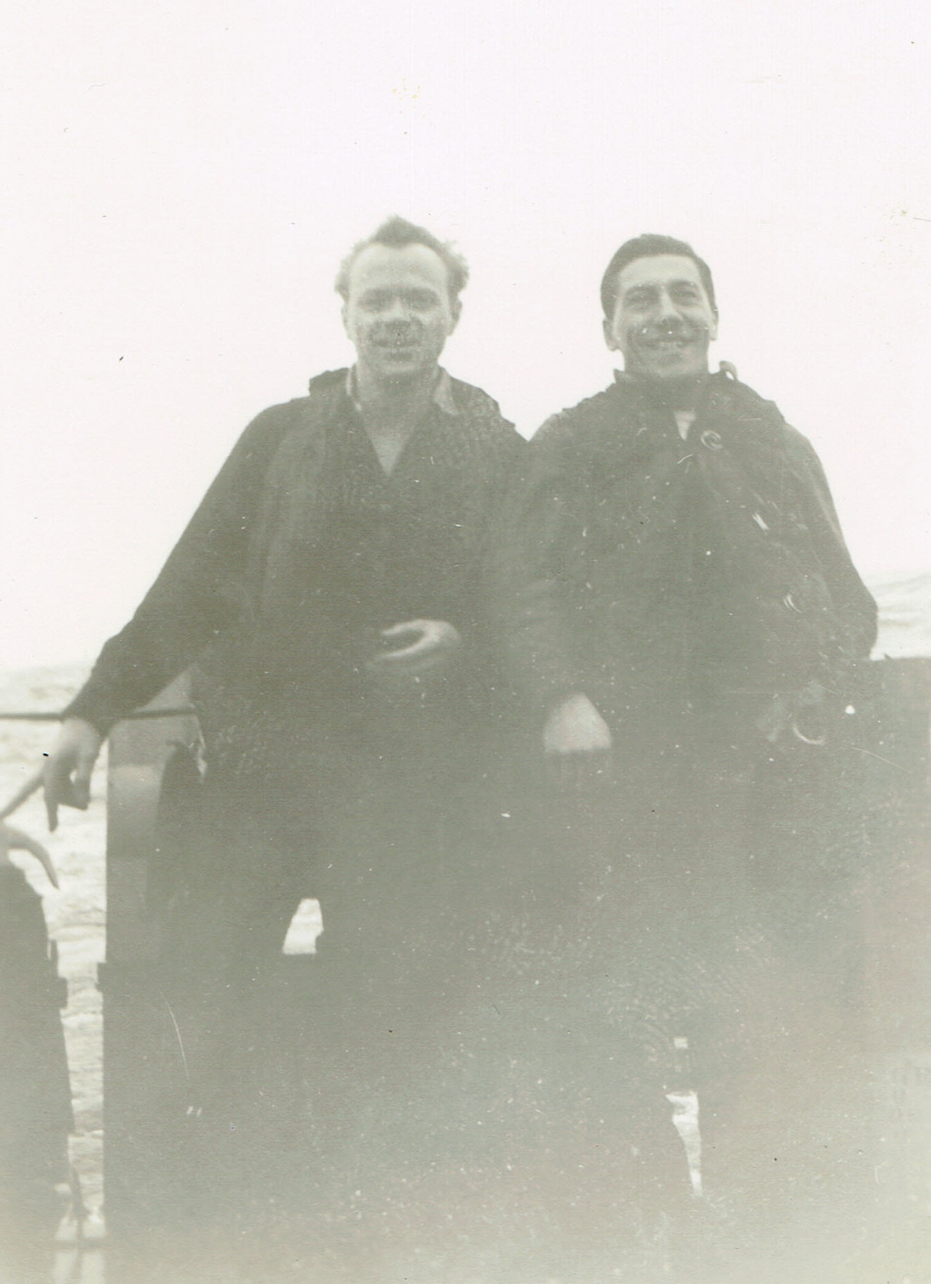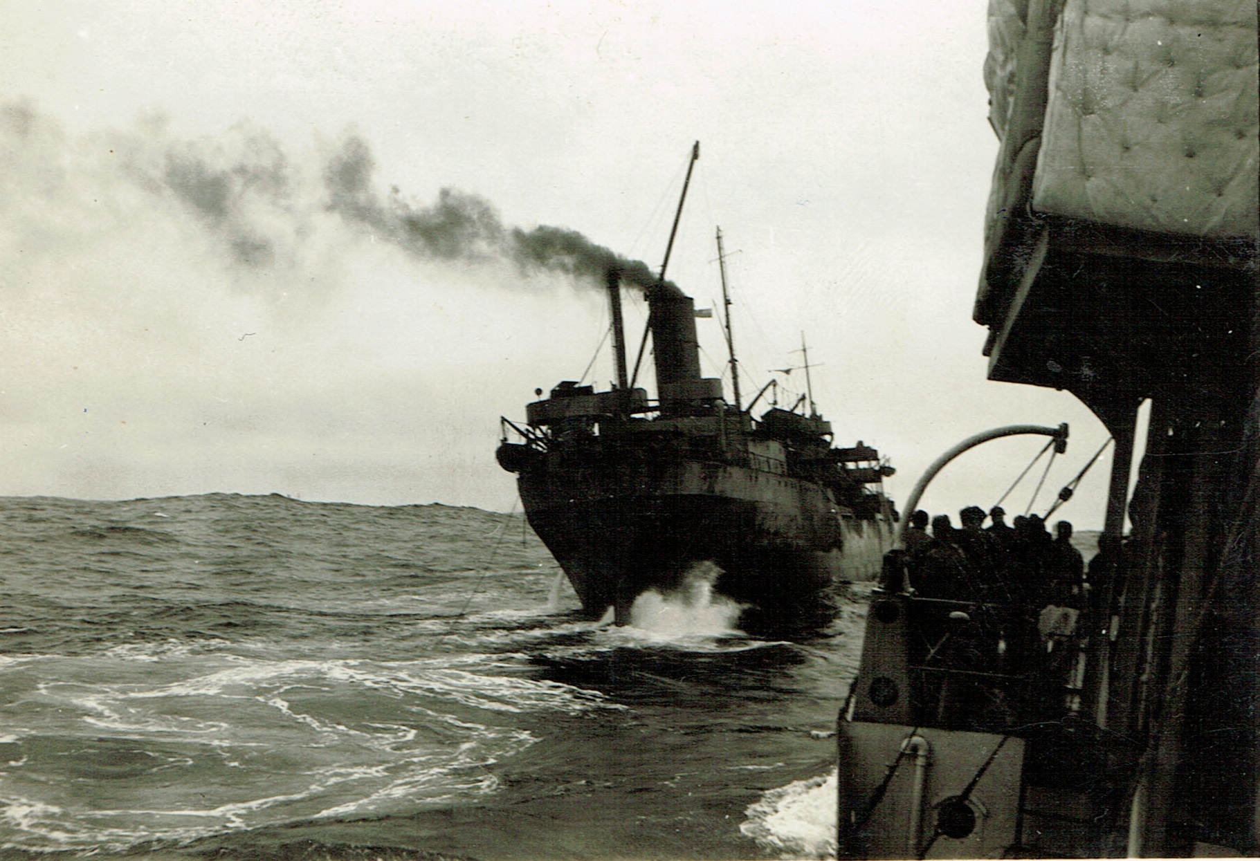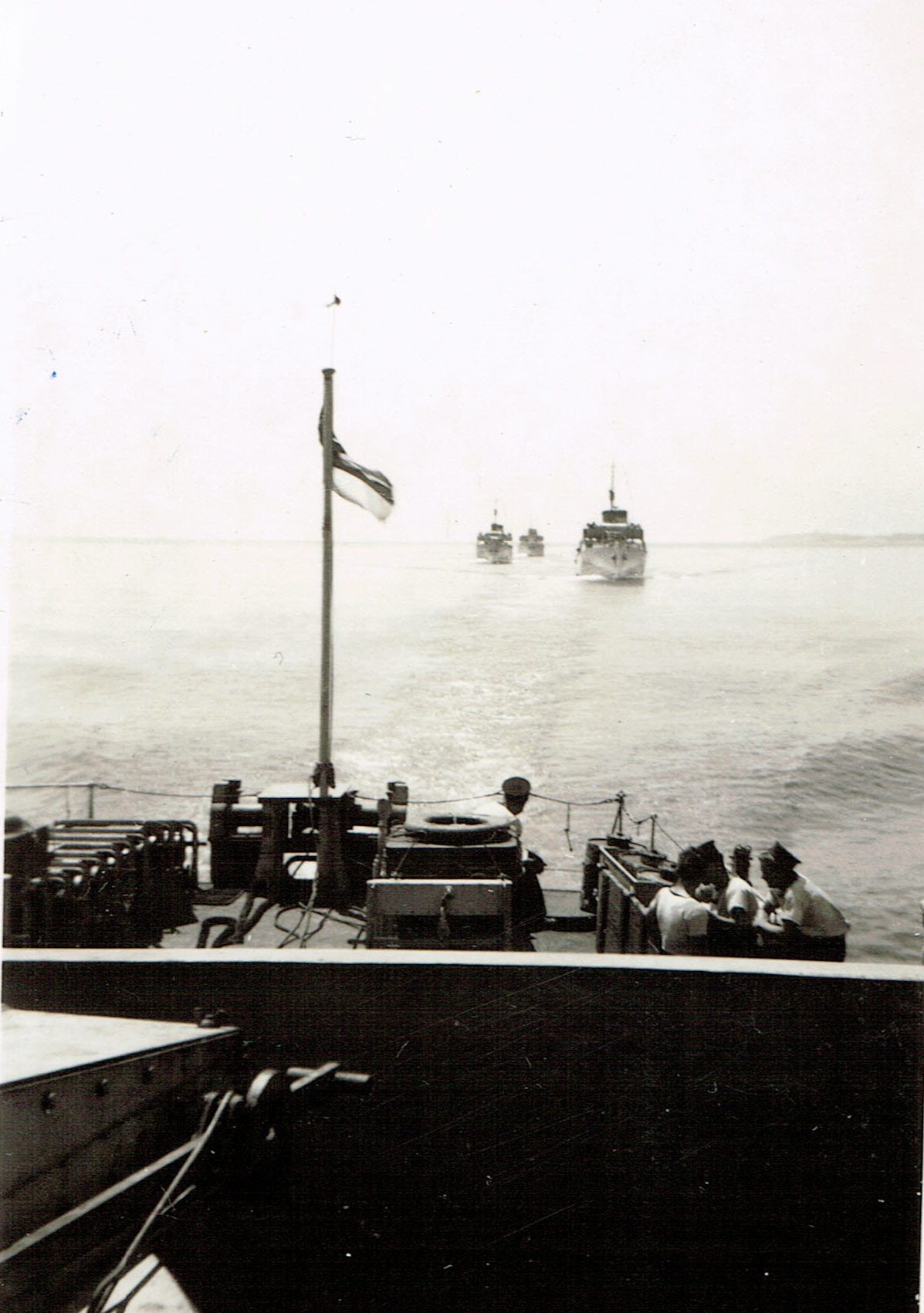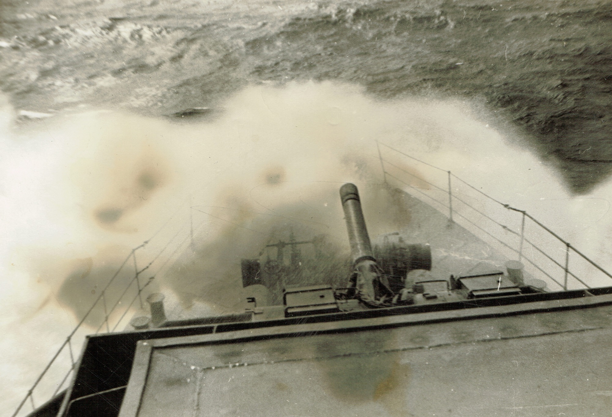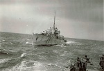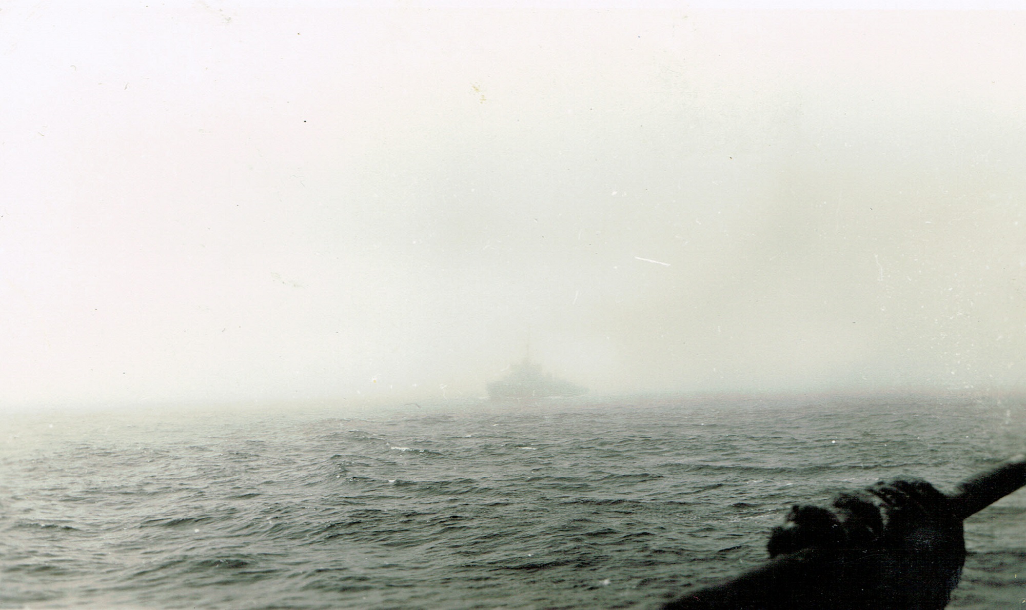 (PJ24) Shipmates Pete Dalphe and Jack Dyso (PJ25) HMCS ST BONIFACE J332 jacket patch - based on the ship's badge (PJ26) Convoy escorts in line ahead - photo taken from HMCS ST BONIFACE J332 (PJ27) A foggy day at sea - with a ship barely visible, approaching HMCS ST BONIFACE J332 (PJ28) HMCS ST BONIFACE J332 bites into a wave in heavy seas