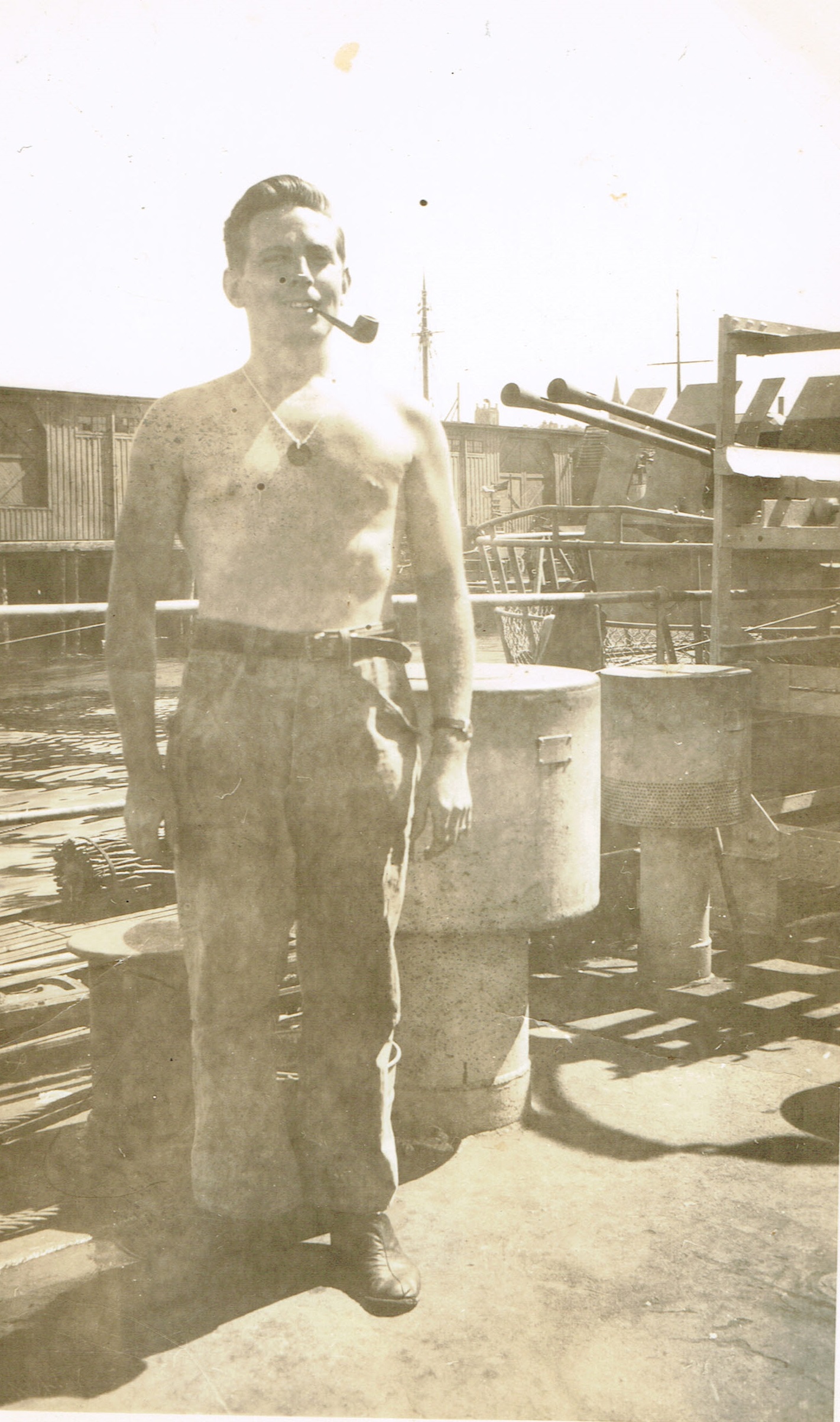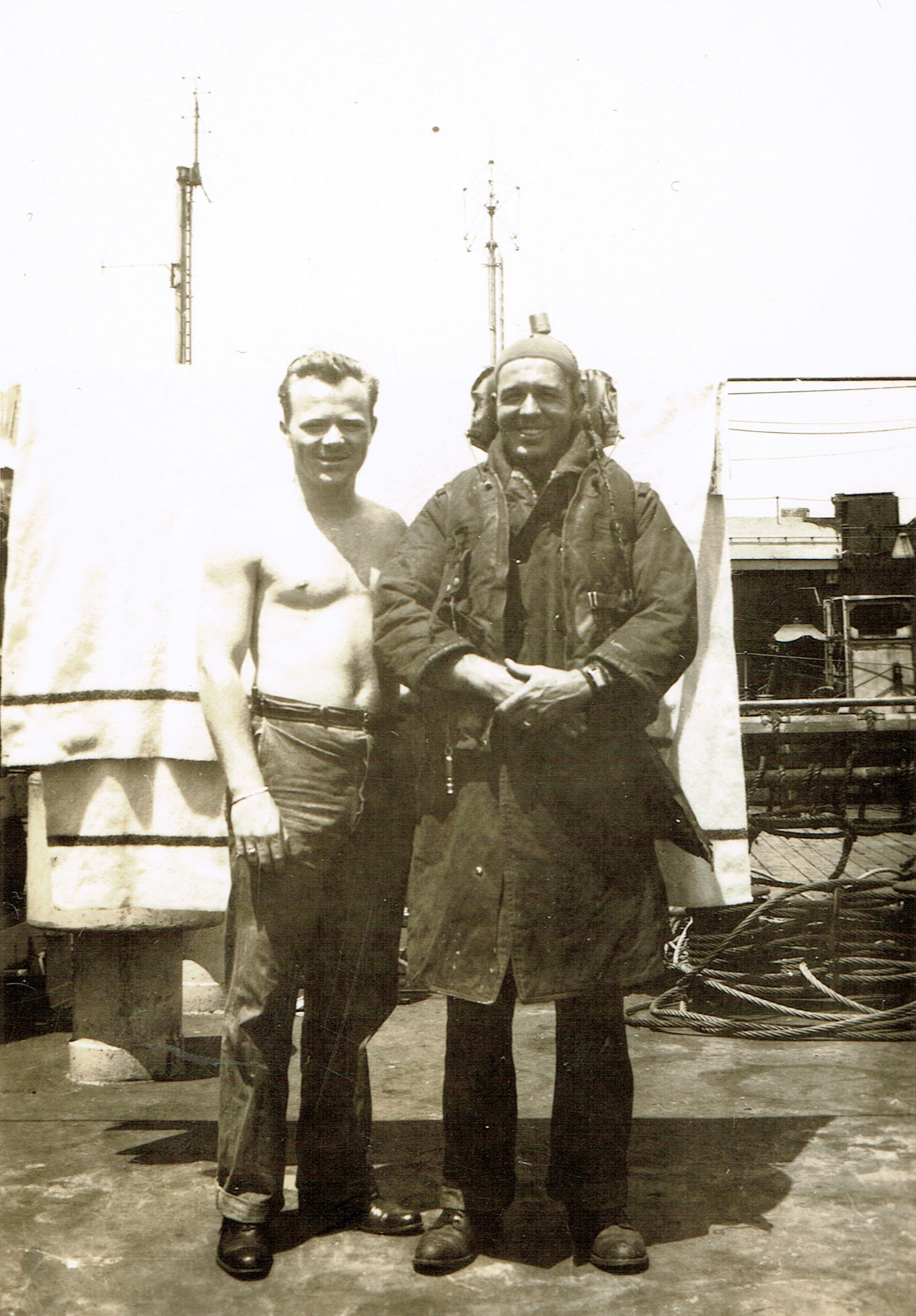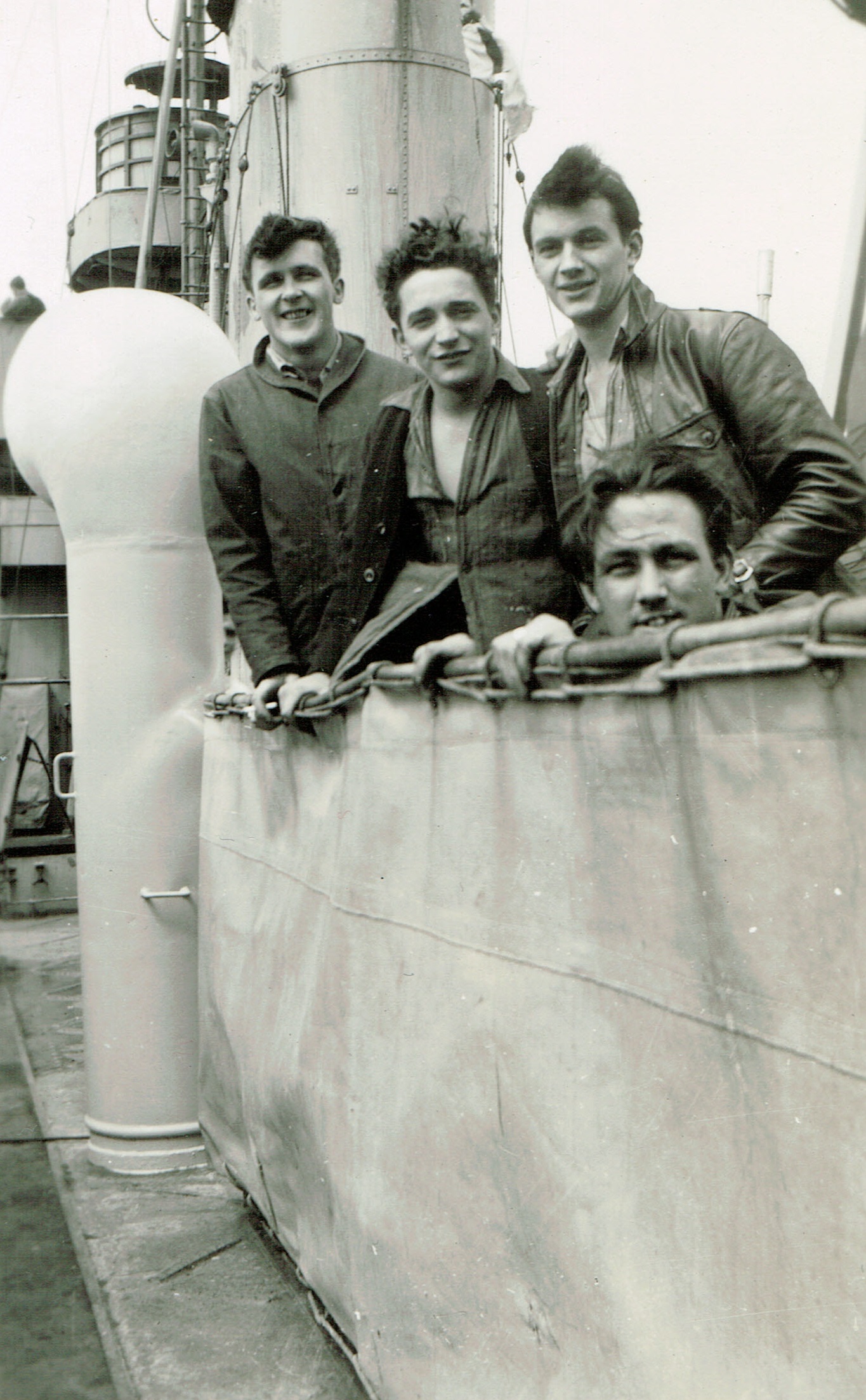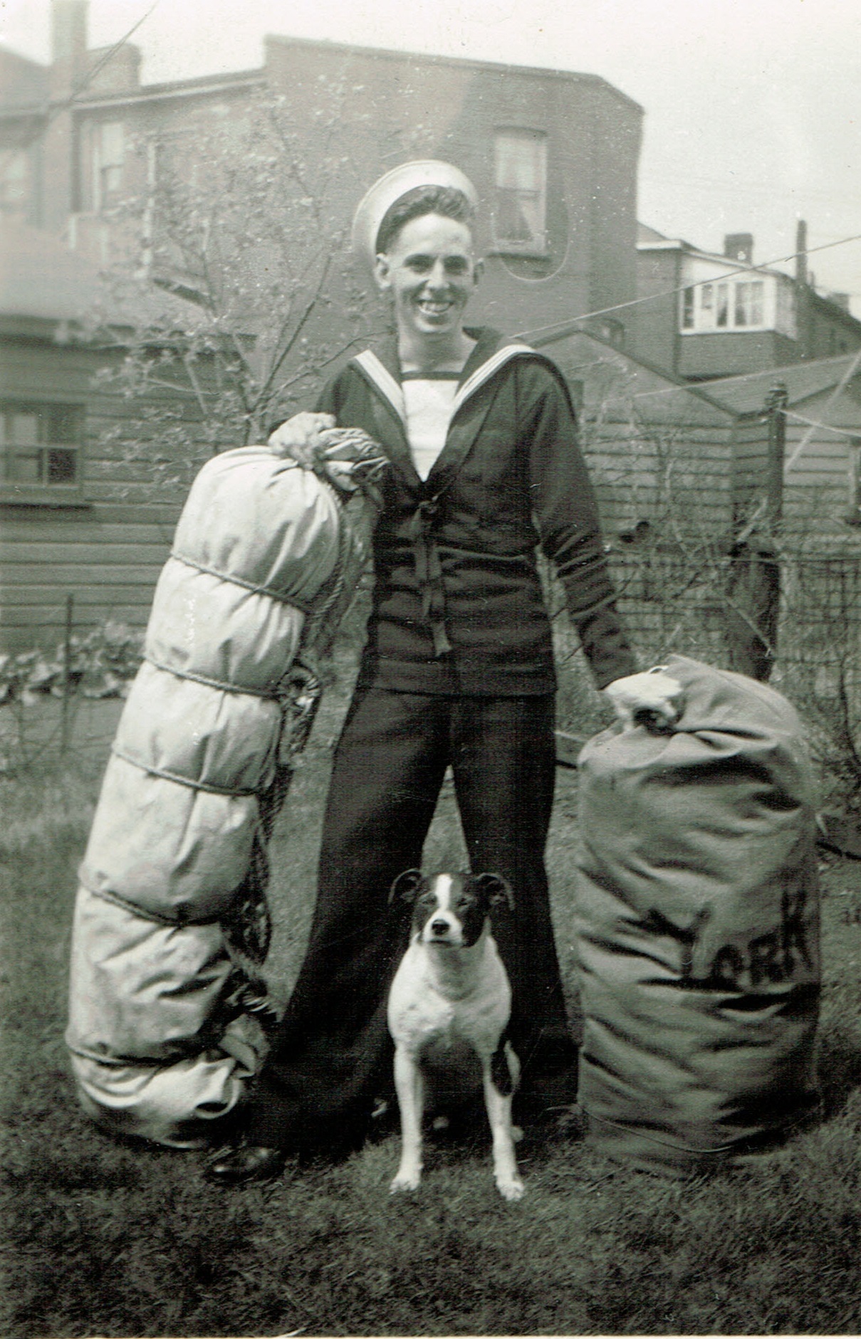 (PJ29) Paul James and shipmates on weekend R&R (PJ30) Stray dog that was on HMCS ST BONIFACE J332 for a while (PJ31) Stoker Al Gardener on HMCS ST BONIFACE, Halifax, NS (PJ32) Stoker Paul James on HMS ST BONIFACE J332, Halifax, NS (PJ33) Stokers from HMCS ST BONIFACE J332 on the jetty with HMCS ALGONQUIN R17 in the background