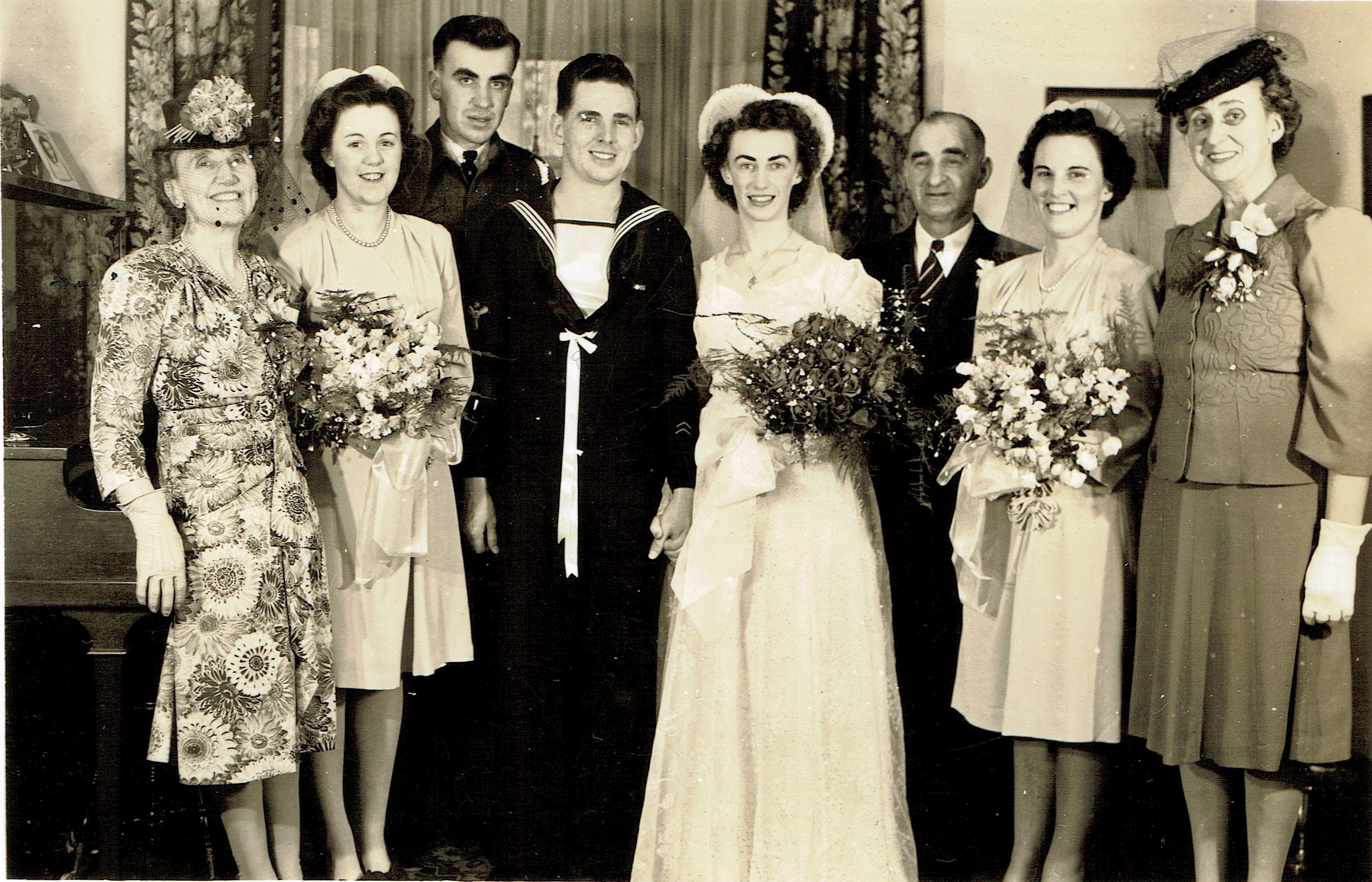 (PJ02) Stoker Paul James - 1943 (PJ03) Paul James - May 1943 (PJ04) At Roy Roman's home at the Arm in Halifax - Paul James on the right with a pipe (PJ05) Paul and Sheila James on their wedding day, Toronto, ON - 05 May 1945 (PJ06) Paul and Sheila James - Family wedding photo - 05 May 1945
