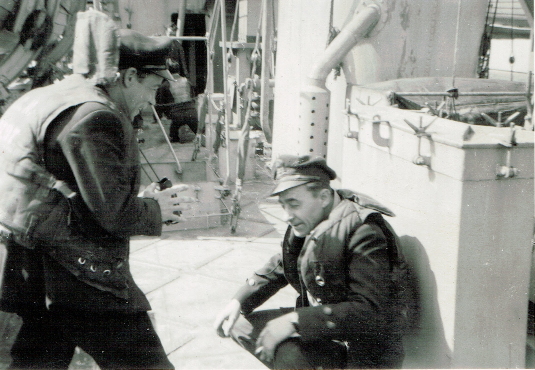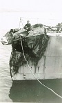 (PJ34-PJ37) Unknown sailors on HMCS ST BONIFACE J332 (PJ36) Eldon Robinson front right with only his head visible over the canvas wave dodger